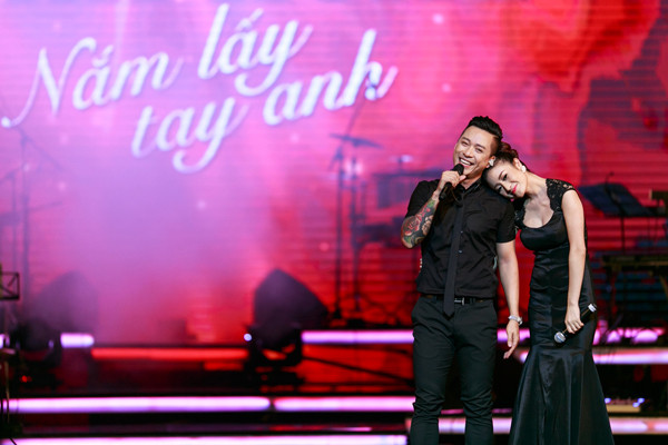Không chỉ thân mật với Văn Mai Hương, Tuấn Hưng còn không ngần ngại để MC Phí Thùy Linh tựa đầu vào vai. Cô là người em gái mà nam ca sĩ quý mến trong nhiều năm qua.