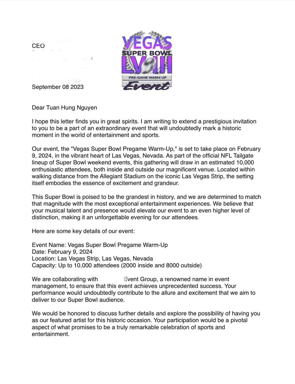 | Bức thư BTC Super Bowl gửi Tuấn Hưng, được ca sĩ chia sẻ trên trang cá nhân. |