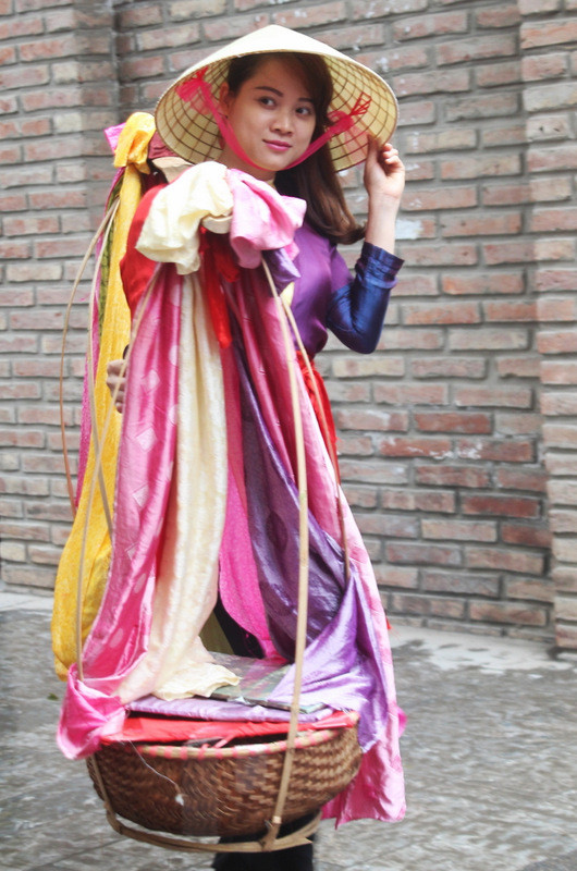 Những cô gái trẻ quẩy quang gánh chở lụa trên vai.