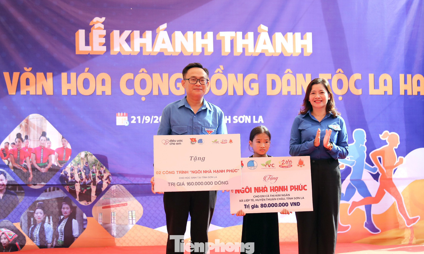 Đồng thời, trao biển tượng trưng hỗ trợ xây dựng 7 công trình “Trường đẹp cho em”; 3 công trình “Ngôi Nhà Hạnh Phúc” cho trẻ em mồ côi có hoàn cảnh khó khăn; 1 công trình “Sân chơi thiếu nhi”. Hỗ trợ trang thiết bị cho Nhà Văn hóa Cộng đồng dân tộc La Ha.