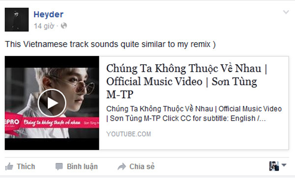 Trong một diễn biến khác, mới đây, chủ nhân của We Don't Talk Anymore bản remix - DJ nổi tiếng Heyder đã chia sẻ đường link của MV Chúng ta không thuộc về nhau do Sơn Tùng thể hiện, kèm đó là dòng trạng thái: “This Vietnamese track sounds quite similar to my remix” (Tạm dịch: Bản nhạc Việt Nam này khá giống với bản remix của tôi).