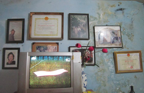 - Bức tường phòng khách ẩm mốc, treo bằng khen và hình ảnh thời trẻ của nhạc sĩ. Ảnh: Châu Mỹ.