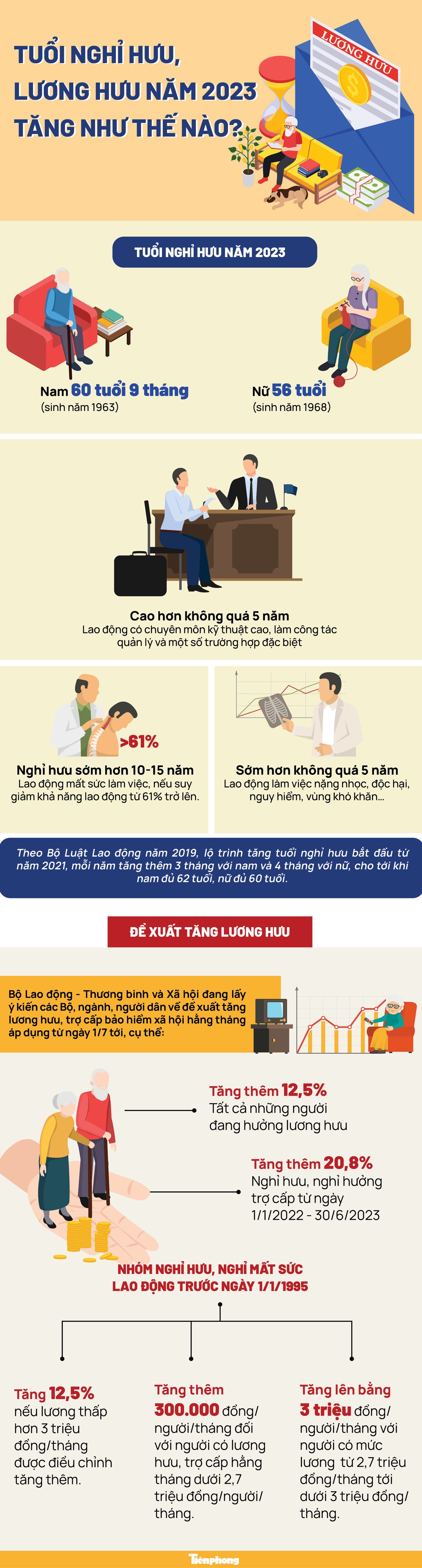 TPO - Năm 2023, tuổi nghỉ hưu tiếp tục điều chỉnh tăng theo quy định tại Bộ Luật lao động năm 2019; mức lương hưu được đề xuất tăng từ ngày 1/7 tới đây.