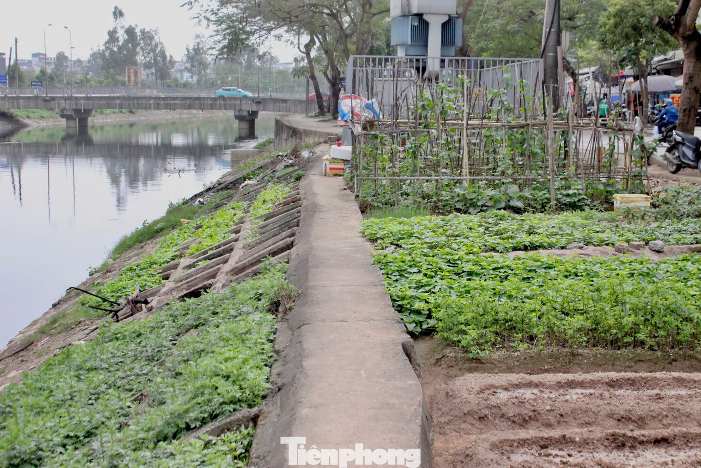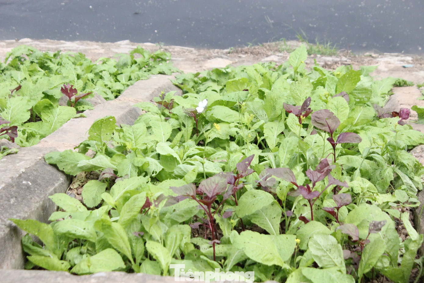 | Dọc theo bờ sông Tô Lịch, có một số khu vực người dân tận dụng những ô đất ở bờ kè ven sông làm nơi trồng rau. Nước tưới rau được lấy từ sông Tô Lịch - dù rất ô nhiễm. |