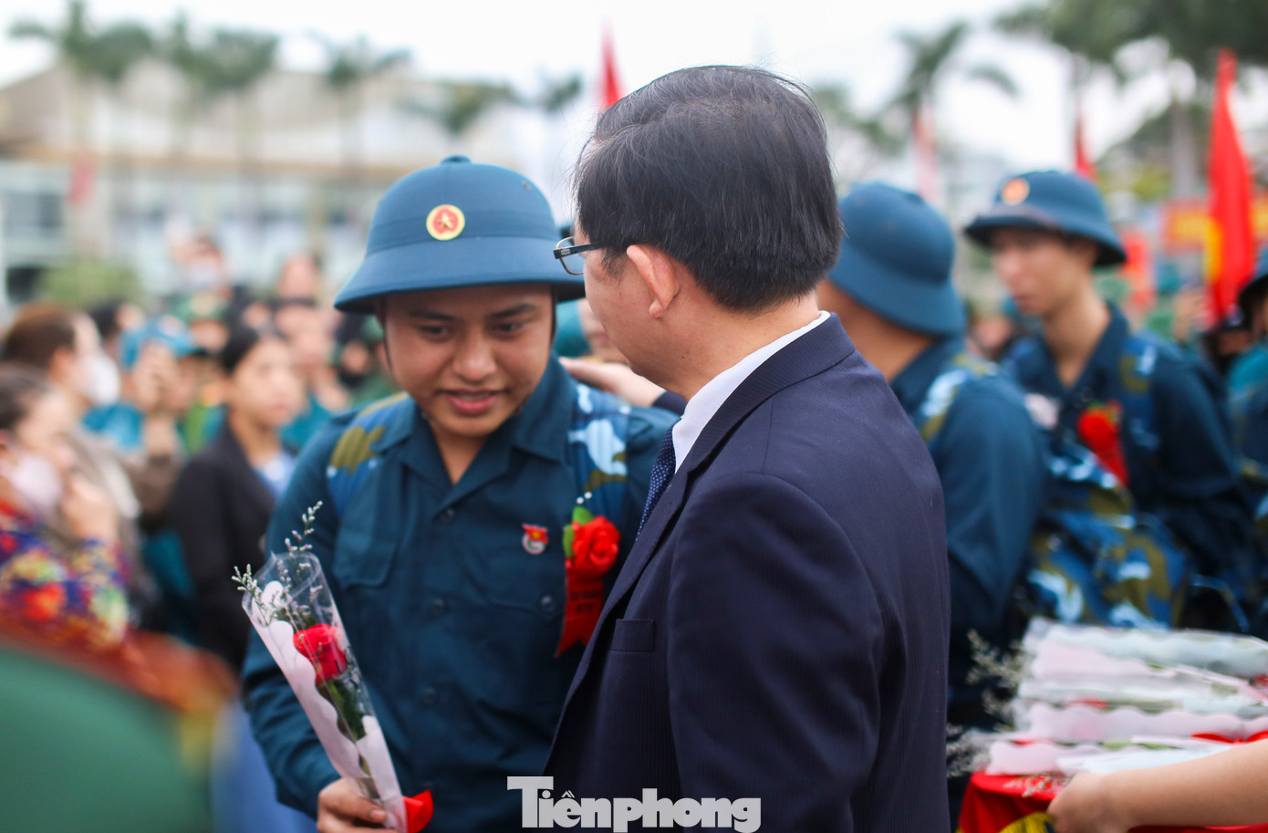 | Lãnh đạo địa phương động viên tân binh lên đường nhập ngũ. Ảnh: Biện Cường |