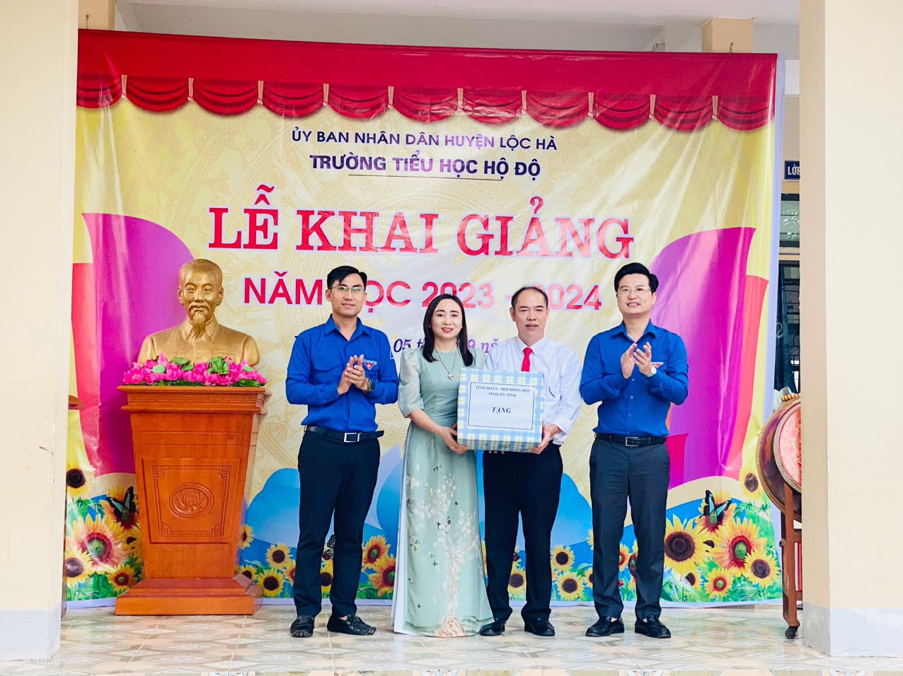 | Trong ngày khai giảng, Tỉnh Đoàn, Hội đồng Đội tỉnh Hà Tĩnh phối hợp với các đơn vị trao tặng 7 nhà vệ sinh cho em tại các trường học trên toàn tỉnh trị giá gần 700 triệu đồng. Trong ảnh: Ban Thường vụ tỉnh Đoàn, Hội đồng Đội tỉnh Hà Tĩnh cùng các đơn vị trao tặng công trình vệ sinh tại điểm trường Tiểu học Đức Thanh (huyện Đức Thọ). |