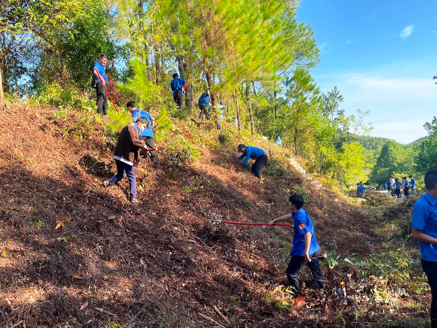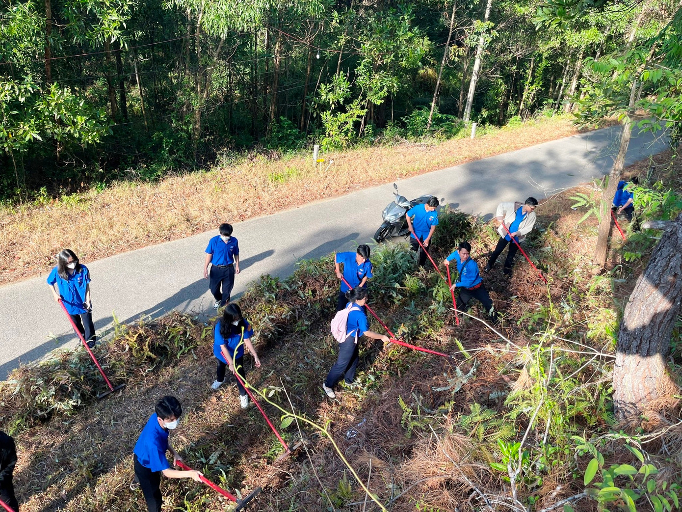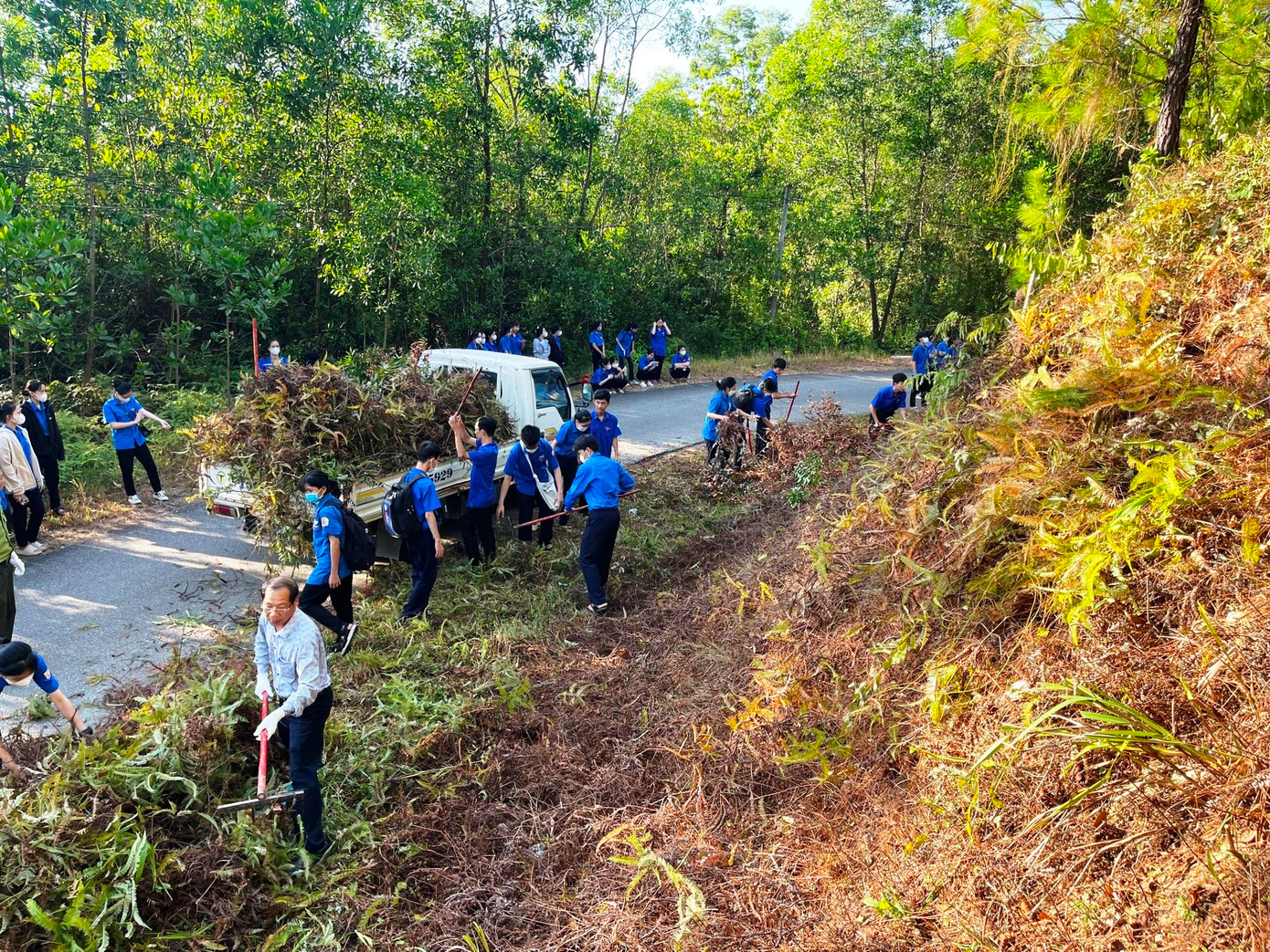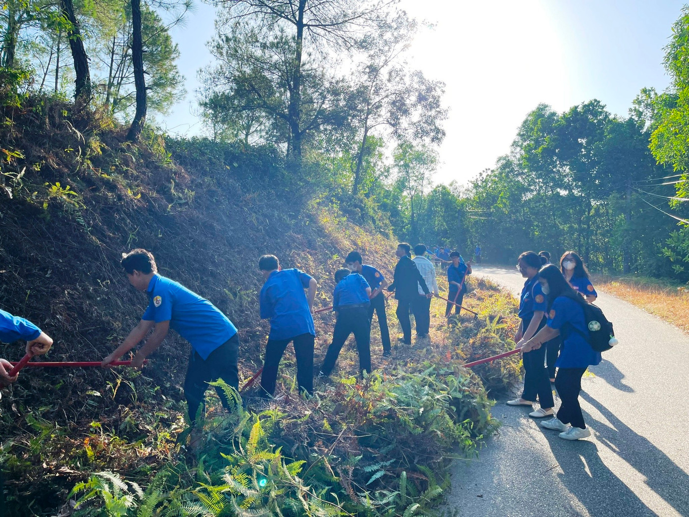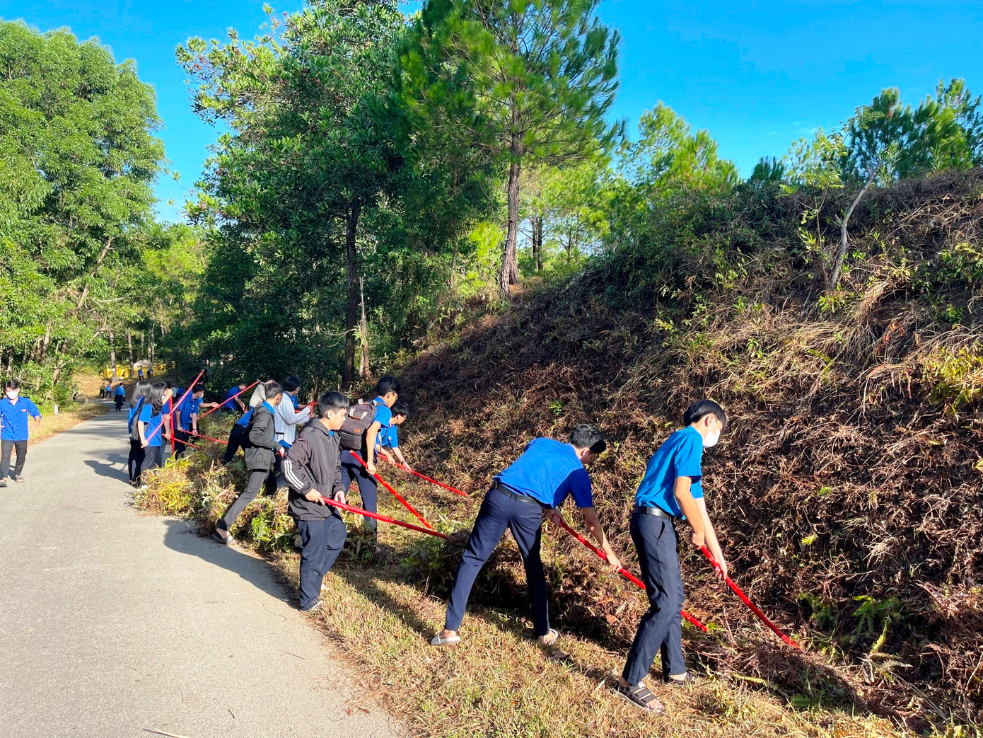 Đoàn viên, thanh niên TP Huế đã thực hiện phát quang và thu gom thực bì, lá cây khô là tác nhân dễ cháy ra khỏi rừng thông cảnh quan. Ảnh: TĐ Huế