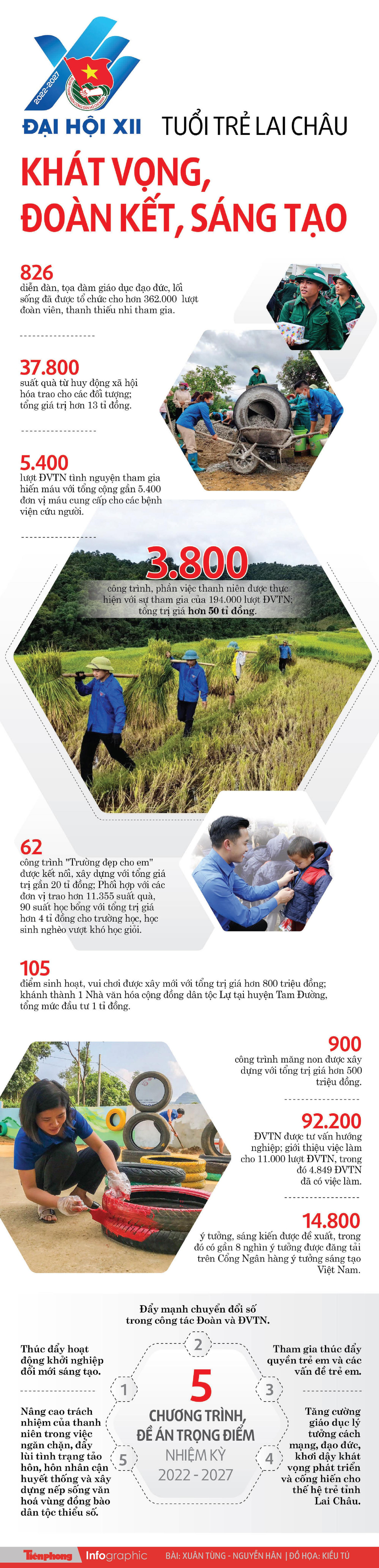 TPO - Tuổi trẻ Lai Châu đã ghi nhiều dấu ấn trong nhiệm kỳ 2017 – 2022. Đại hội Đoàn TNCS Hồ Chí Minh tỉnh Lai Châu lần thứ XIV, nhiệm kỳ 2022-2027 nêu cao tinh thần hành động "khát vọng, bản lĩnh, đoàn kết, sáng tạo, phát triển", quyết tâm thực hiện thắng lợi các chỉ tiêu, chương trình, đề án trọng điểm.