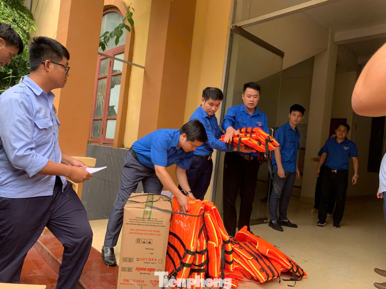 | Trao quà hỗ trợ tuổi trẻ địa phương tham gia phòng chống bão lũ. |