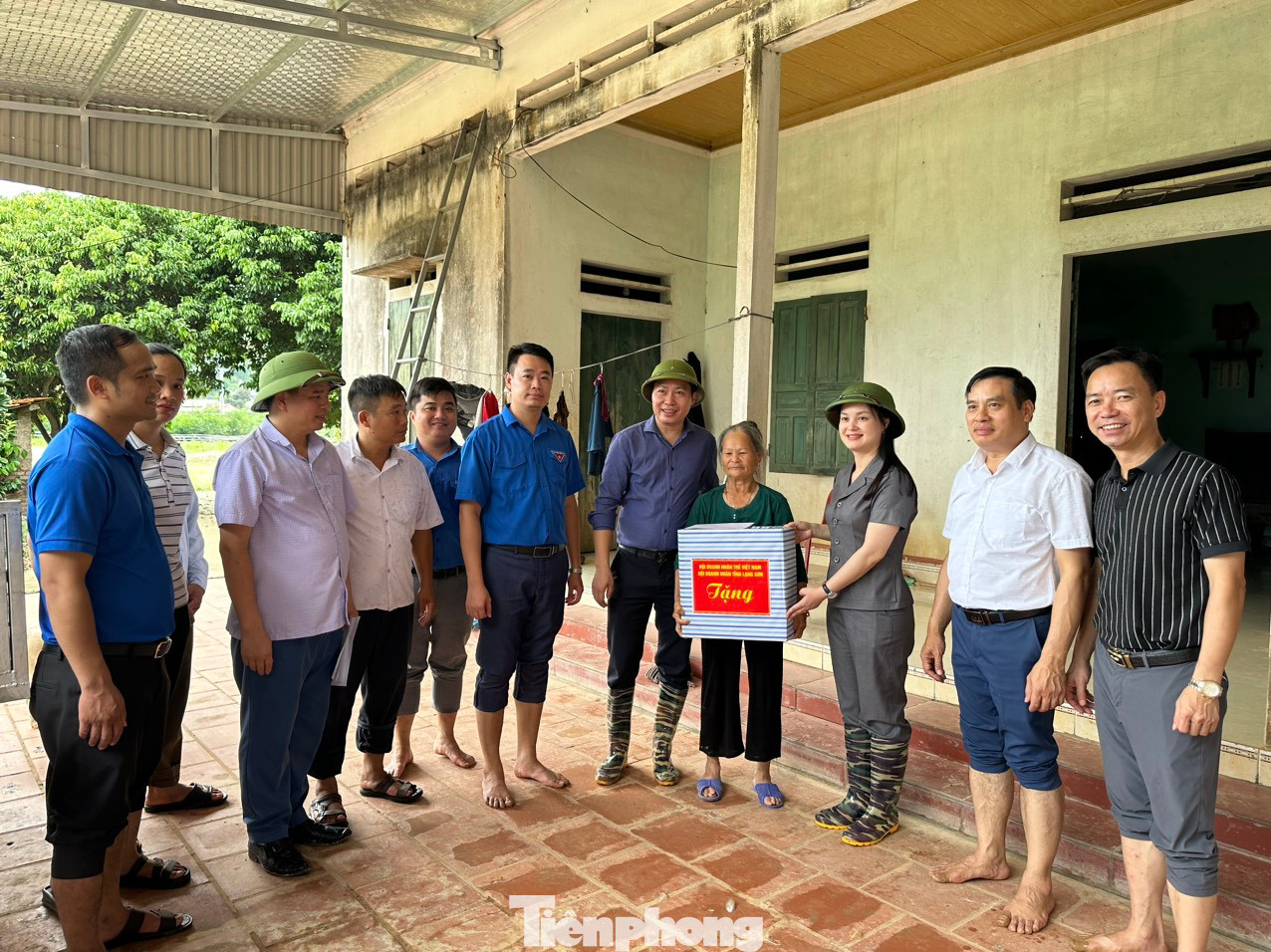 | Anh Hoàng Công Đoàn - Phó Chủ tịch Hội Doanh nhân trẻ Việt Nam (giữa) và đoàn công tác trao 100 triệu đồng cho huyện Hữu Lũng khắc phục hậu quả bão lũ. Ảnh: Duy Chiến |