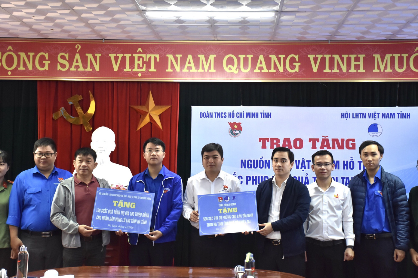 Cũng trong ngày, Tỉnh Đoàn Bình Dương, Hội Doanh nhân trẻ tỉnh Bình Dương và Đoàn thanh niên Công an Tỉnh Bình Dương trao tặng 100 suất quà trị giá 100 triệu đồng cho nhân dân vùng lũ lụt Hà Tĩnh và tặng 500 sạc pin dự phòng cho các đội hình thanh niên tình nguyện ứng phó với thiên tai. Đoàn cũng trực tiếp trao tặng 20 suất quà trị giá 20 triệu đồng cho người dân tại xã Thượng Lộc (Can Lộc).