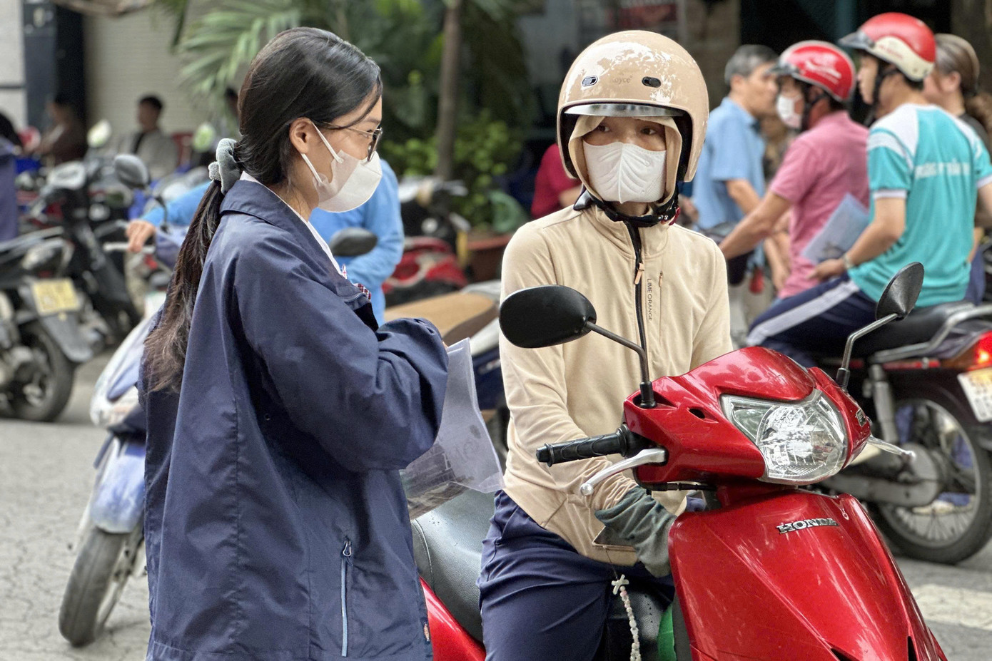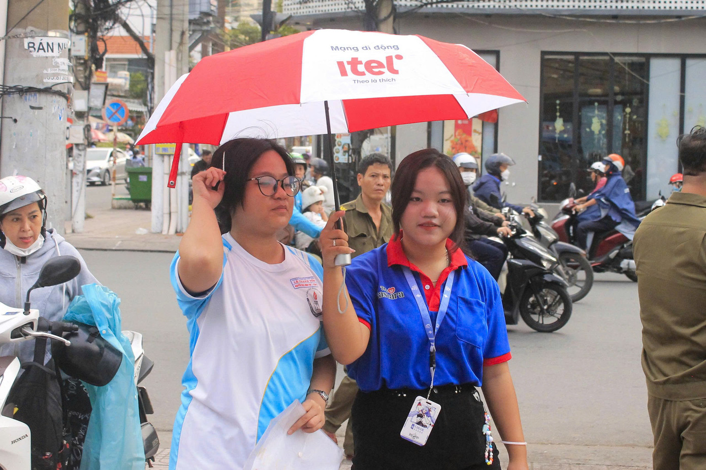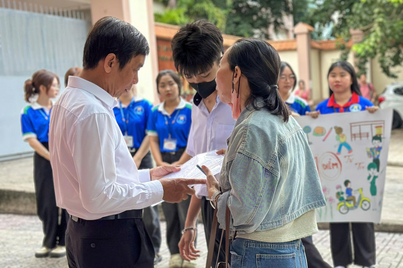 | Tại cổng điểm thi, các bạn sinh viên tình nguyện chương trình 'Tiếp sức mùa thi' có mặt từ sớm, hỗ trợ hướng dẫn đường đi. Sinh viên tình nguyện còn trông giữ tài sản, phát nước, động viên tinh thần, điều phối giao thông. |