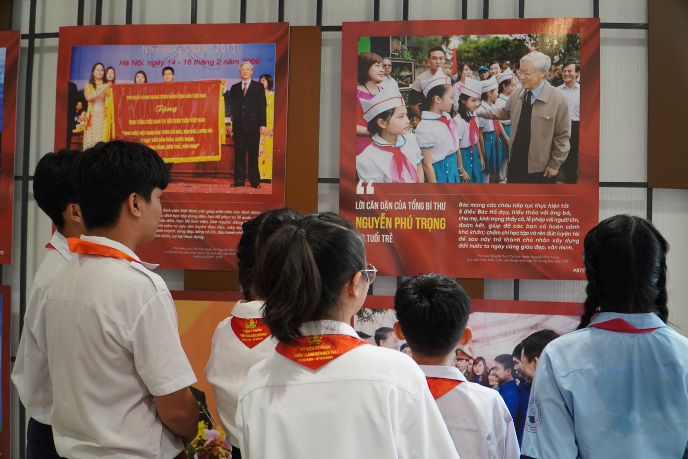 | Các bạn trẻ xúc động khi nhìn lại quá trình sống, làm việc và cống hiến cho đất nước và nhân dân của Tổng Bí thư Nguyễn Phú Trọng. |