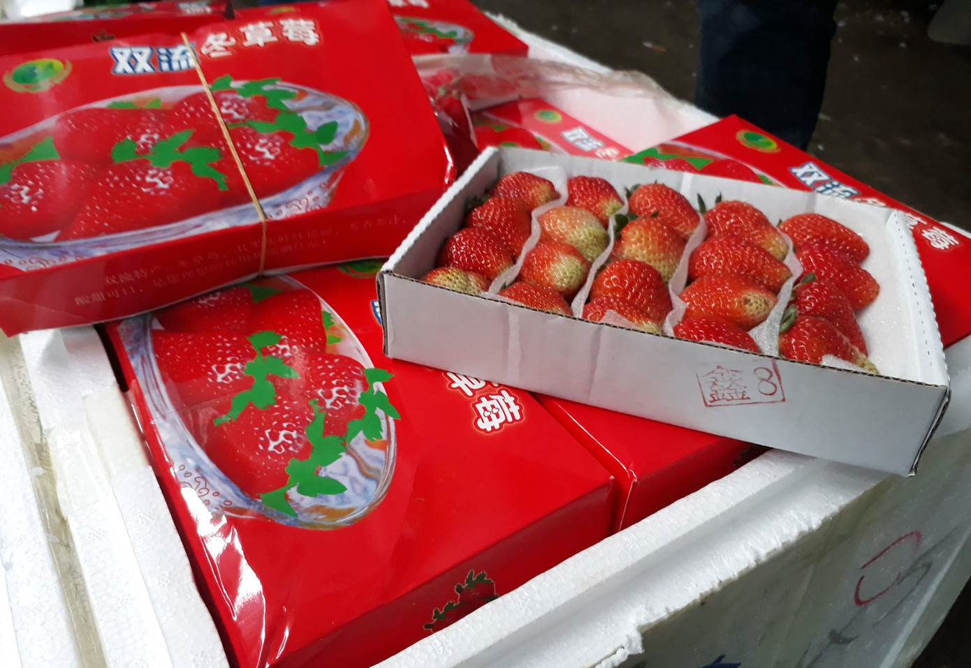 Dâu tây đựng trong thùng xốp, được vận chuyển bằng đường hàng không.