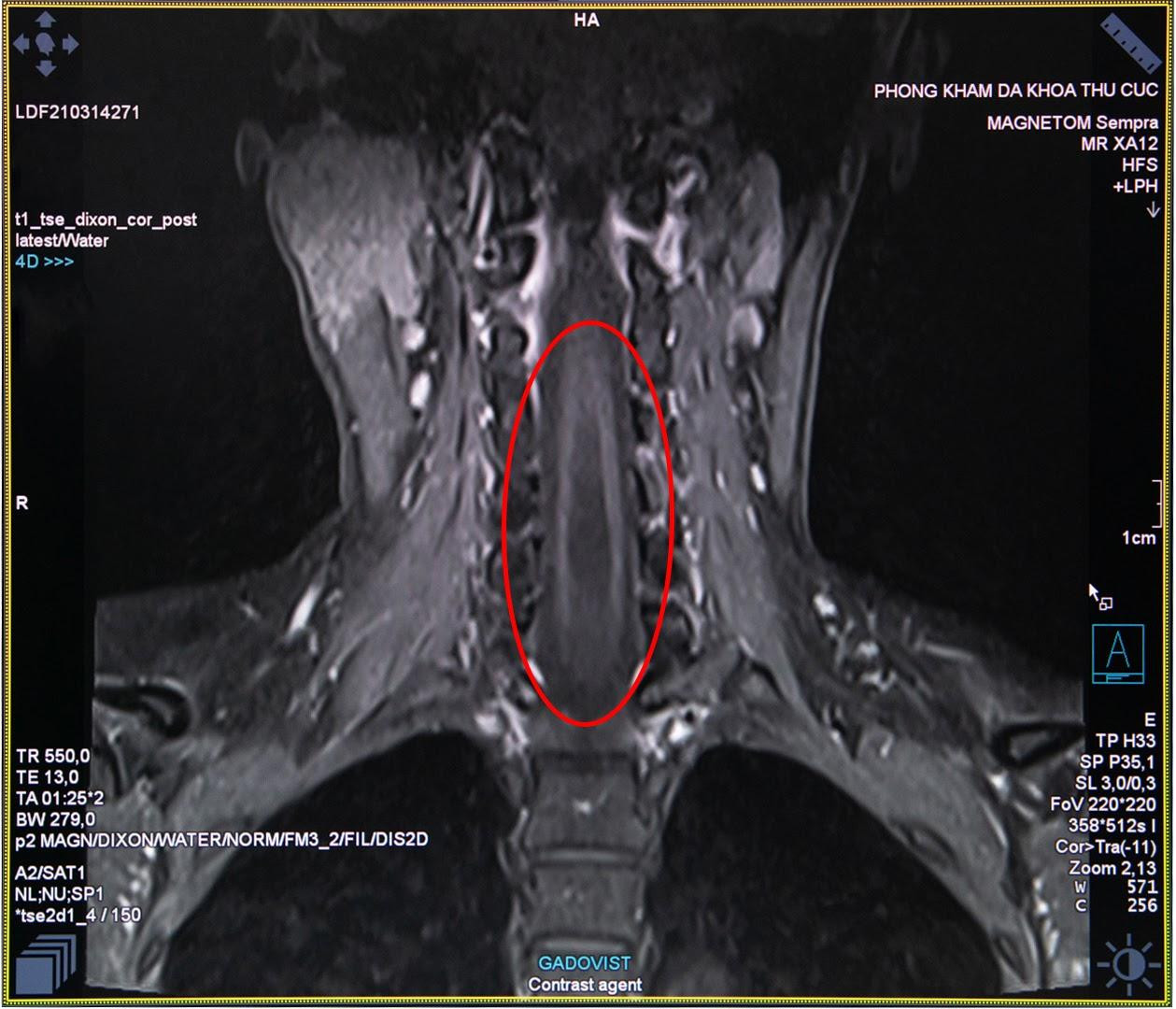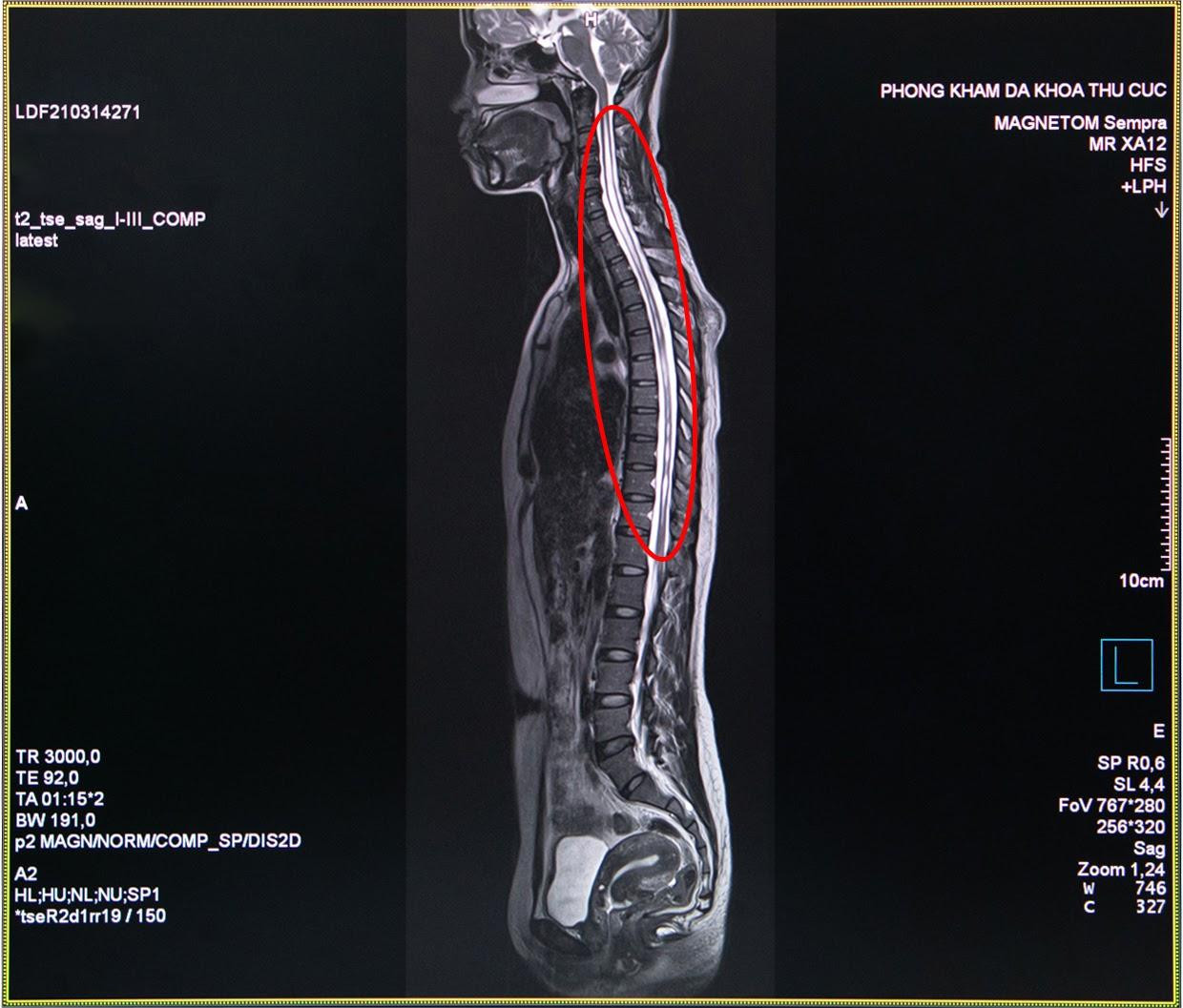 Hình ảnh thu được từ chụp cộng hưởng từ MRI tủy sống của chị H. cho thấy trong đoạn tủy sống của chị hình thành một hốc rỗng chứa các dịch, các dịch này tích lại thành các khoang và nang hốc đây là biểu hiện của căn bệnh rỗng tủy. Ngay sau khi có kết quả khám cận lâm sàng, các bác sĩ của Thu Cúc đã hội chẩn nhằm xác định căn nguyên bệnh và tìm ra phương pháp điều trị tốt nhất cho chị H.