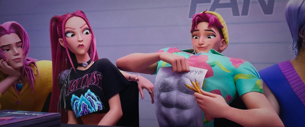 Một trong những ưu điểm dễ nhận thấy nhất của Kpop Demon Hunters là phần hình ảnh rất nịnh mắt. Đó là một sự kết hợp thú vị giữa đồ họa hoạt hình phương Tây và một chút phong cách mang hơi hướng anime. Các cảnh hành động đẹp mắt, các cảnh biểu diễn cuốn hút và có phần hào nhoáng. Một số cảnh vui nhộn xứng đáng trở thành nguồn meme mới như đôi mắt mê mẩn “sáu múi” đều tăm tắp như bắp bỗng nổ bốp bốp thành bỏng ngô.