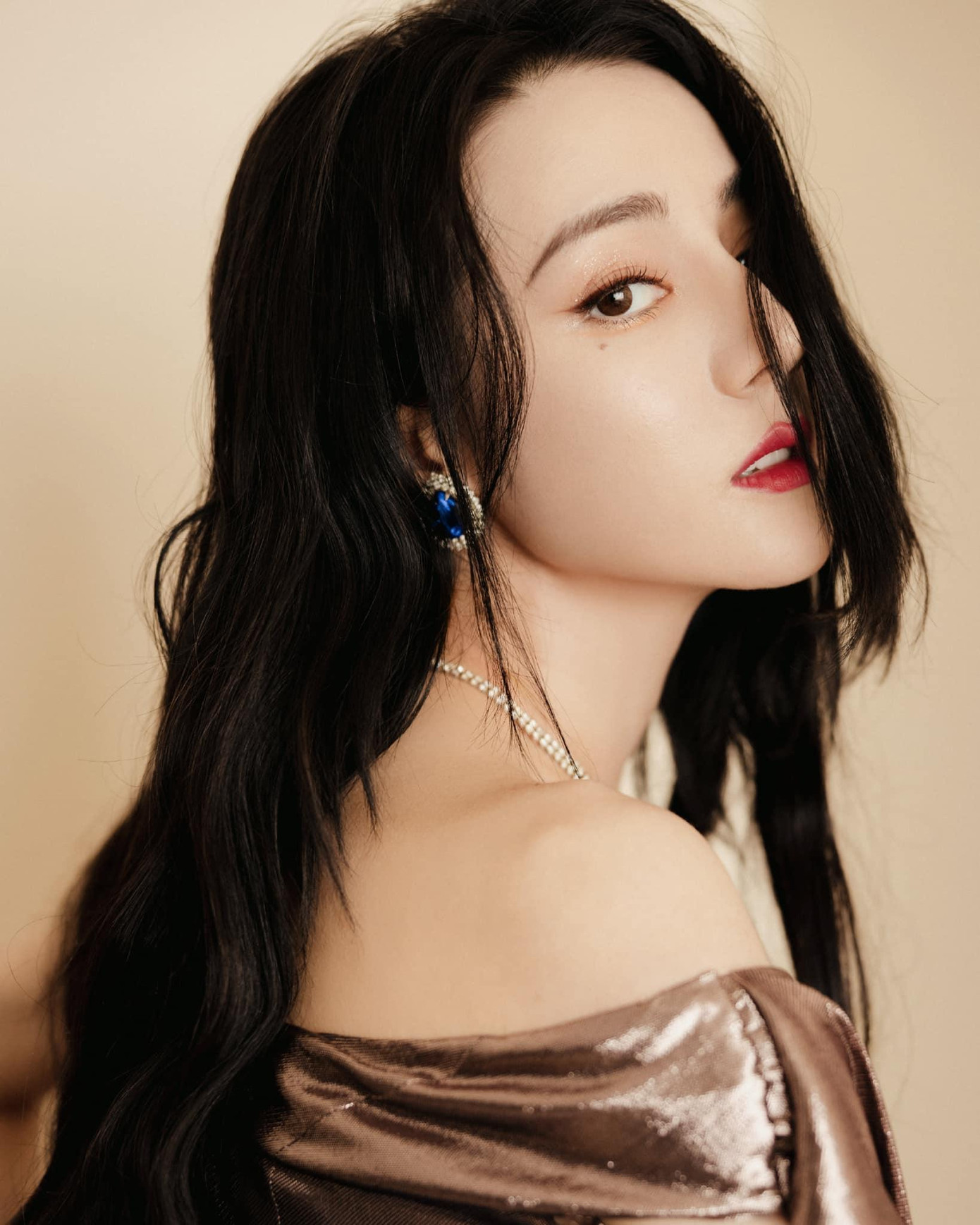 Xưa nay Địch Lệ Nhiệt Ba chuộng tóc xõa mềm mại vén qua tai, khoe trọn vẹn gương mặt thanh tú nhưng lần này, cô lại thả tóc che khuất một nửa gương mặt bên trái.