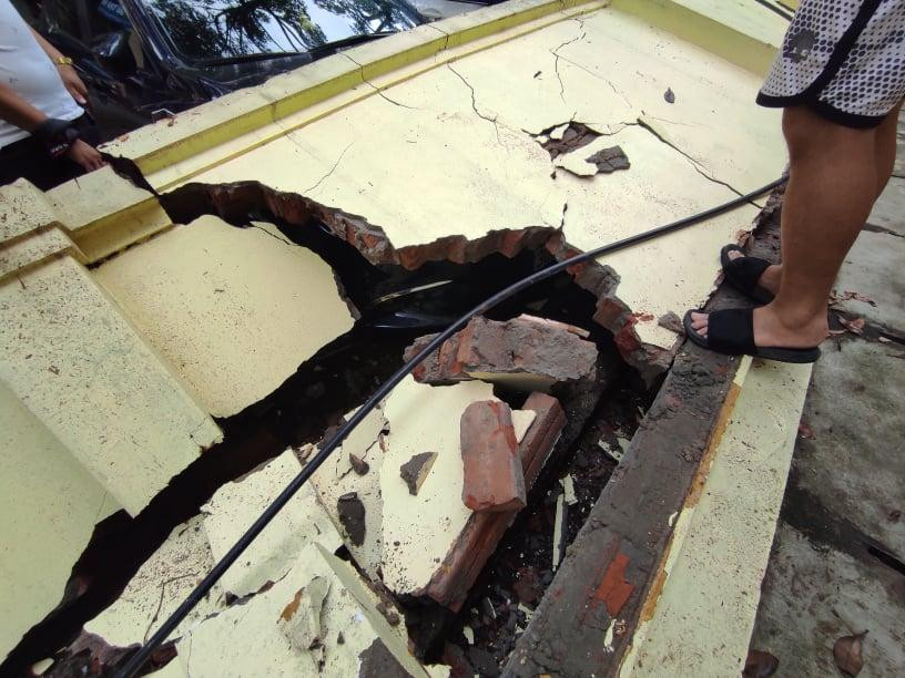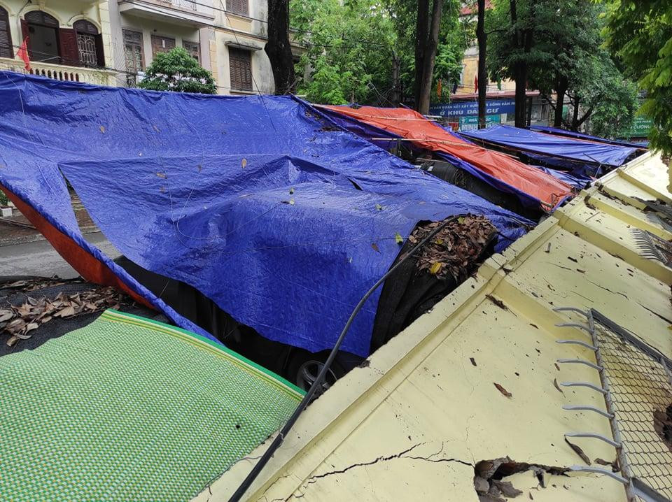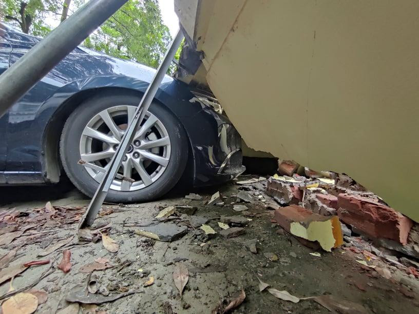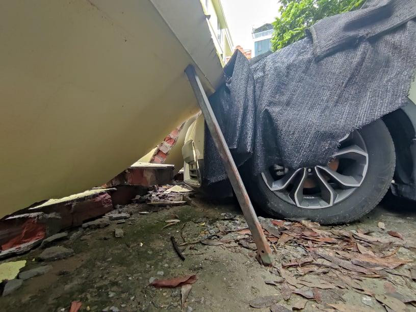 | Nhiều khu vực bức tường vỡ thành nhiều mảnh, đè lên ô tô đỗ bên cạnh |