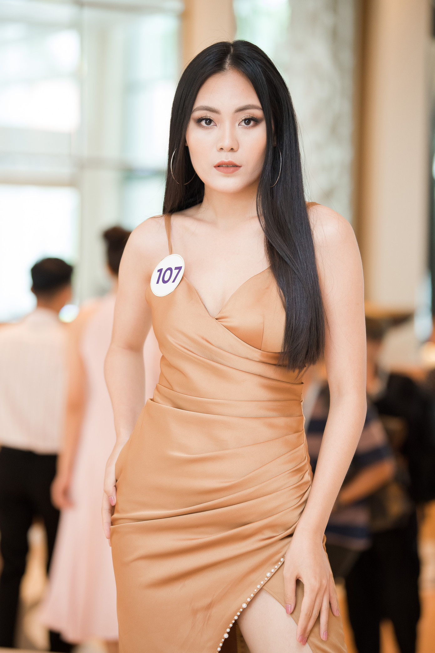 Hoa hậu Sắc đẹp Châu Á 2017 Tường Linh diện váy da báo gợi cảm tới tham dự buổi sơ khảo. Cô sinh năm 1994, chiều cao 1m69, số đo ba vòng 84-53-90.