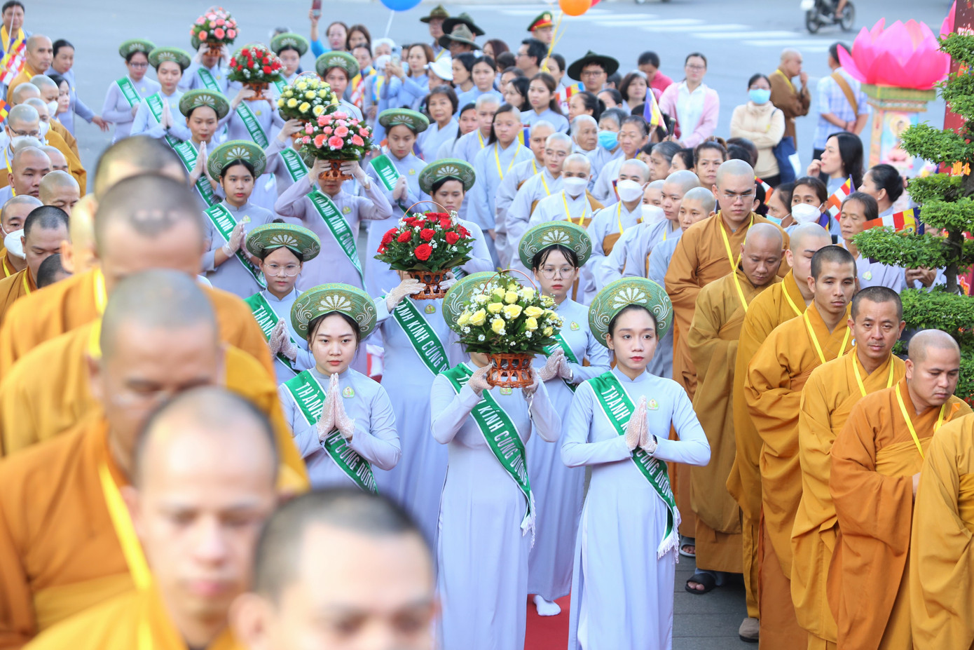 | Ngay từ sáng sớm, các vị giáo phẩm, chư tôn đức, tăng ni cùng hàng trăm phật tử có mặt tại công viên tượng đài Bồ Tát Thích Quảng Đức (quận 3) để tham gia các nghi thức chương trình lễ. |