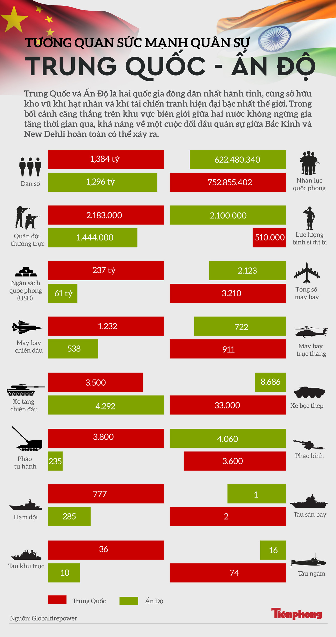 TPO - Trung Quốc và Ấn Độ là hai quốc gia đông dân nhất hành tinh, cùng sở hữu kho vũ khí hạt nhân và khí tài chiến tranh hiện đại bậc nhất thế giới. Trong bối cảnh căng thẳng trên khu vực biên giới giữa hai nước không ngừng gia tăng thời gian qua, khả năng về một cuộc đối đầu quân sự giữa Bắc Kinh và New Dehli hoàn toàn có thể xảy ra.