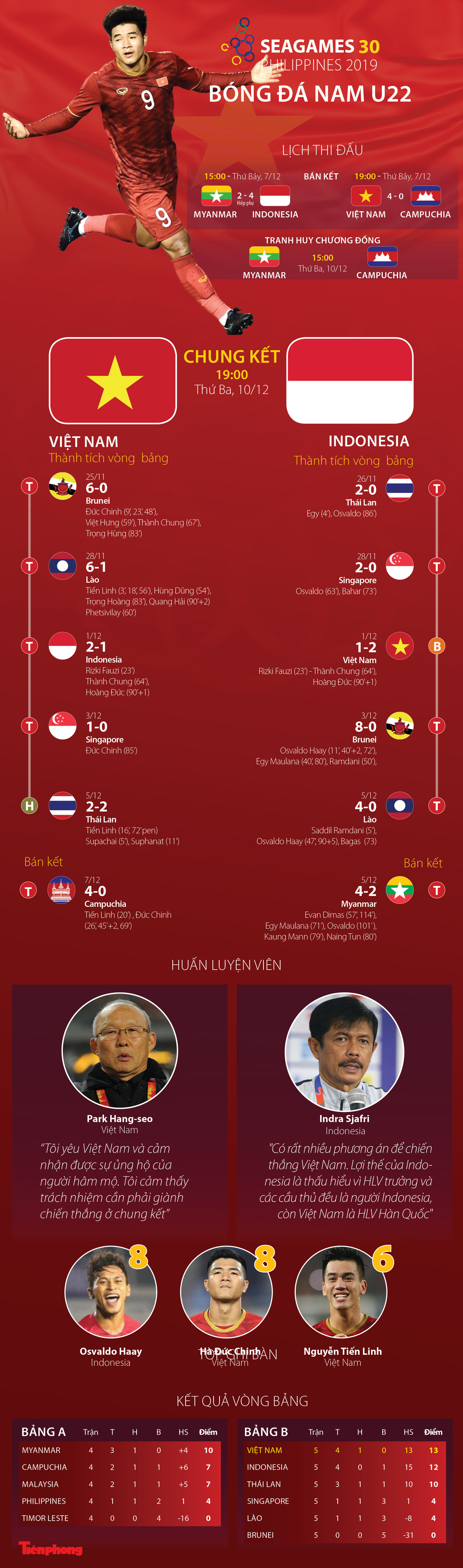 TPO - Trận chung kết môn bóng đá nam SEA Games 30 giữa U22 Việt Nam và U22 Indonesia diễn ra tại sân Rizal Memorial vào 19h ngày 10/12 (giờ Việt Nam).
