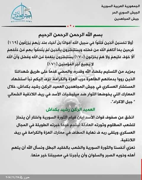 Cùng ngày hôm đó, lực lượng quân đội Syria Tự do (FSA) đã đưa ra thông báo về việc một viên tướng có tên Rasheed Bakdash đã "hy sinh trong khi làm nhiệm vụ" tại Lakatia, khu vực máy bay Su-24 bị bán hạ.