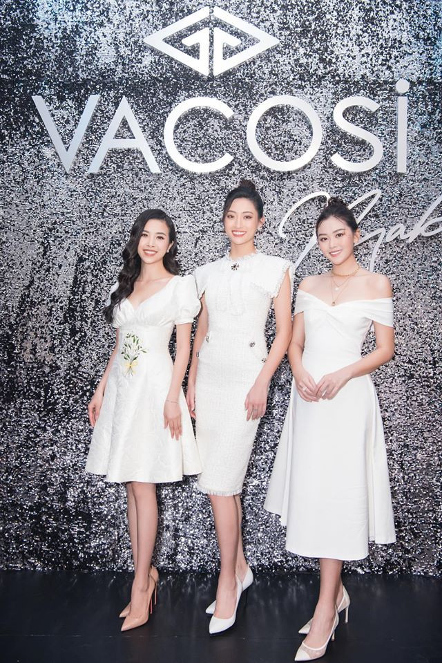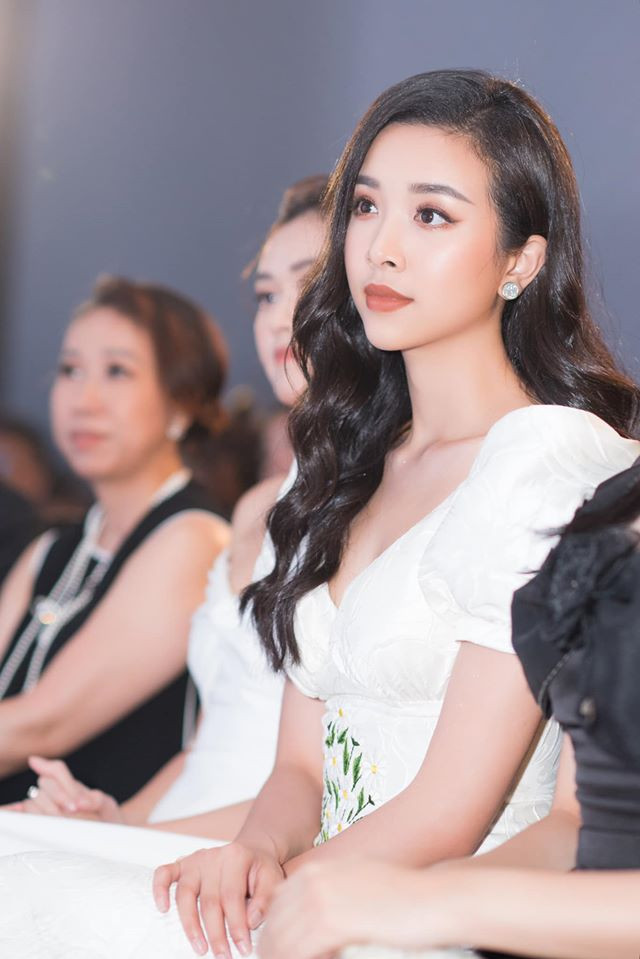 Hoa hậu Lương Thuỳ Linh cũng chọn sắc trắng thanh lịch và kín đáo khi xuất hiện ở sự kiện.