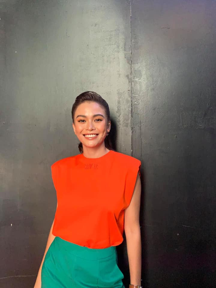 Á hậu Mâu Thuỷ diện set đồ theo xu hướng color-block rực rỡ khi ghi hình.