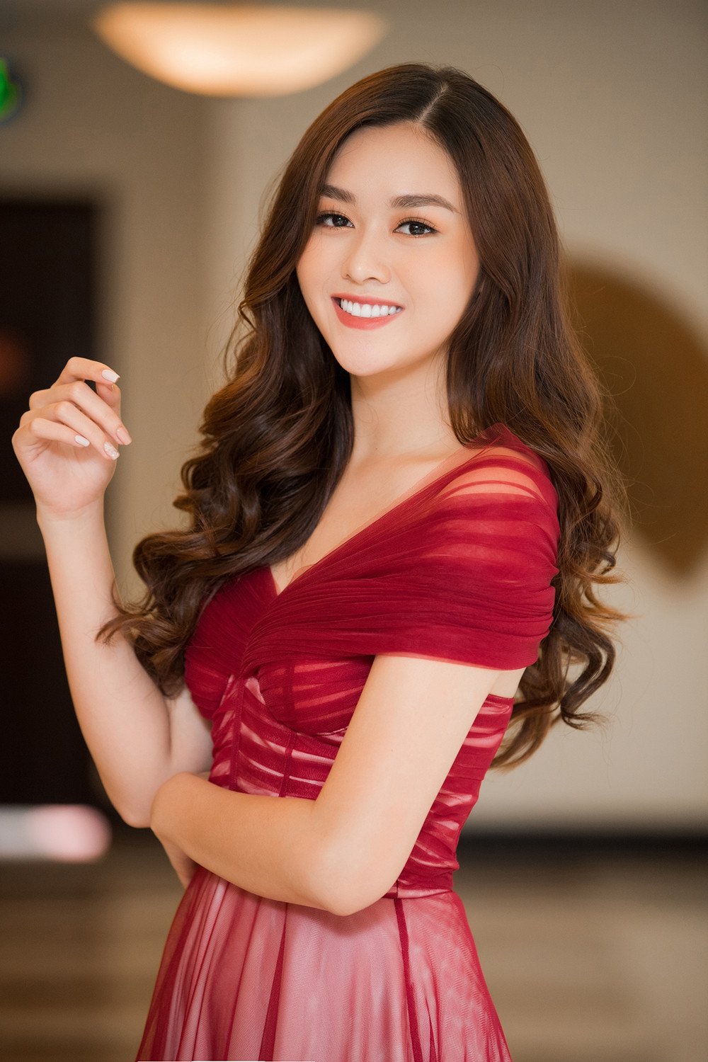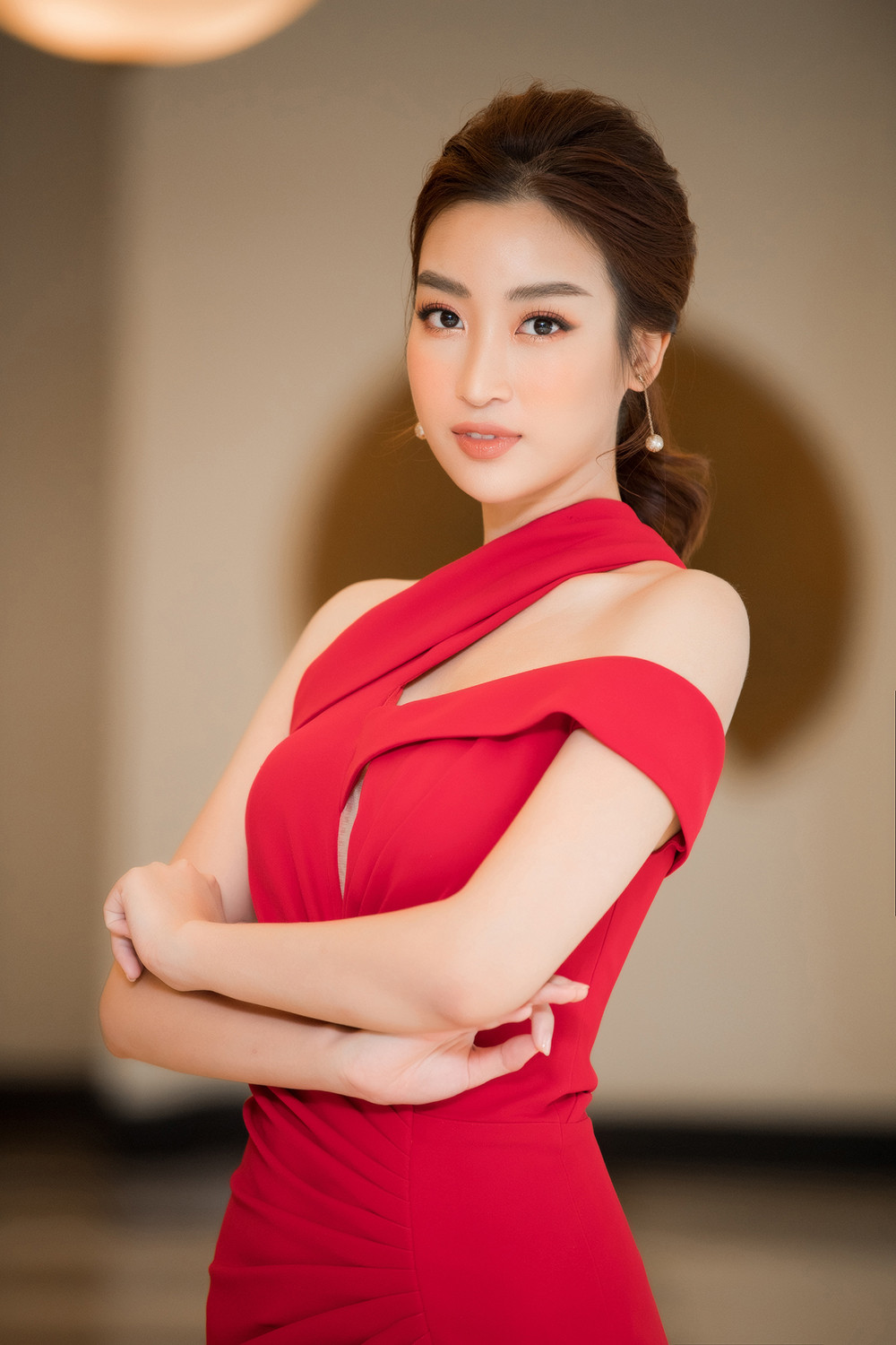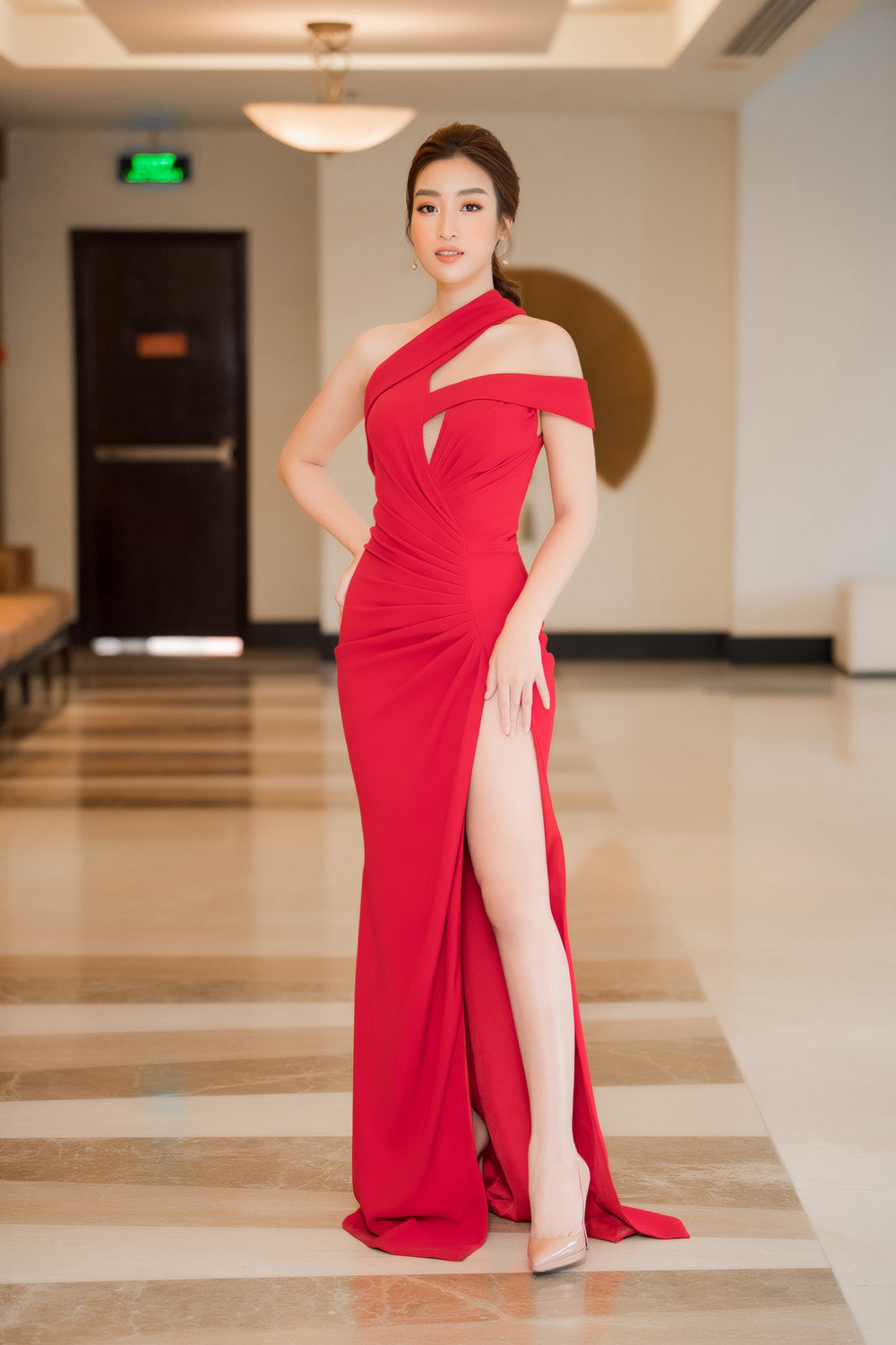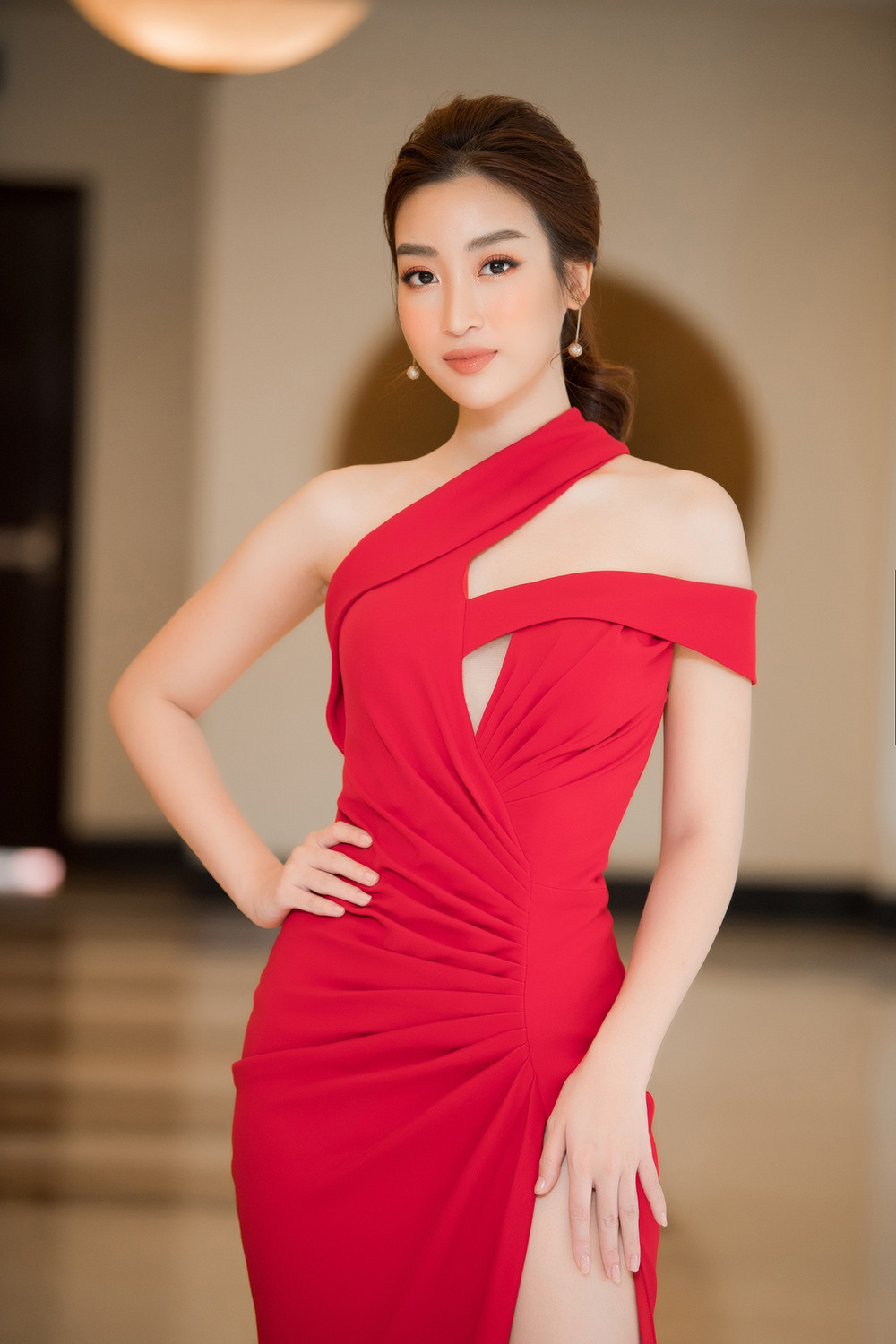 Kiểu váy lệch vai với chi tiết cắt xẻ tinh tế giúp Đỗ Mỹ Linh khoe được vòng một quyến rũ và đôi chân nuột nà. Khác với mái tóc ngắn quen thuộc, Đỗ Mỹ Linh sử dụng tóc xoăn giả cột đuôi gà gọn gàng làm toát lên nét thanh lịch, kiêu sa.