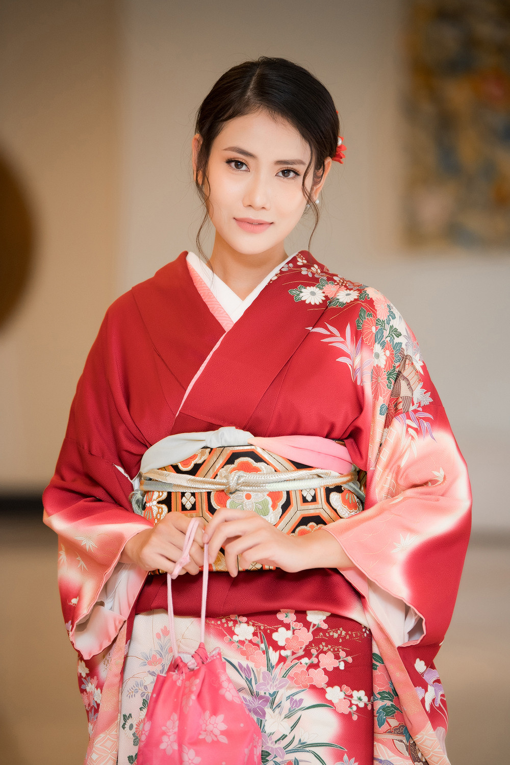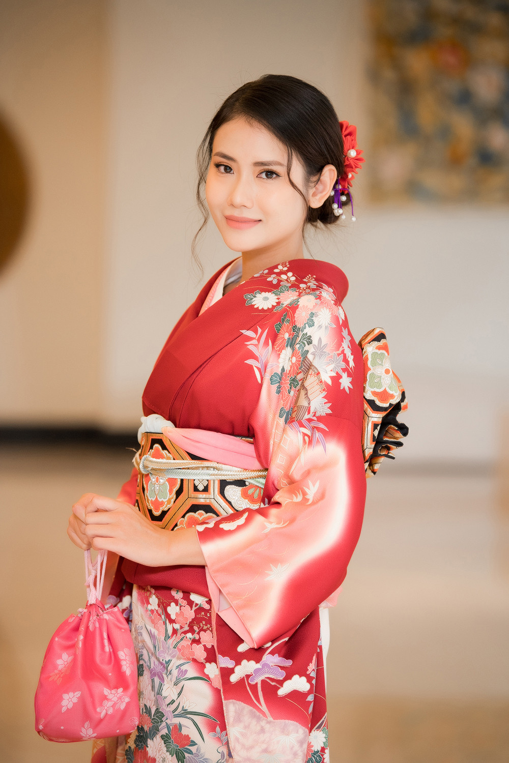 Đại sứ thiện chí Hoa Anh Đào 2019 Diệu Anh trong bộ kimono hoạ tiết hoa màu đỏ độc đáo.