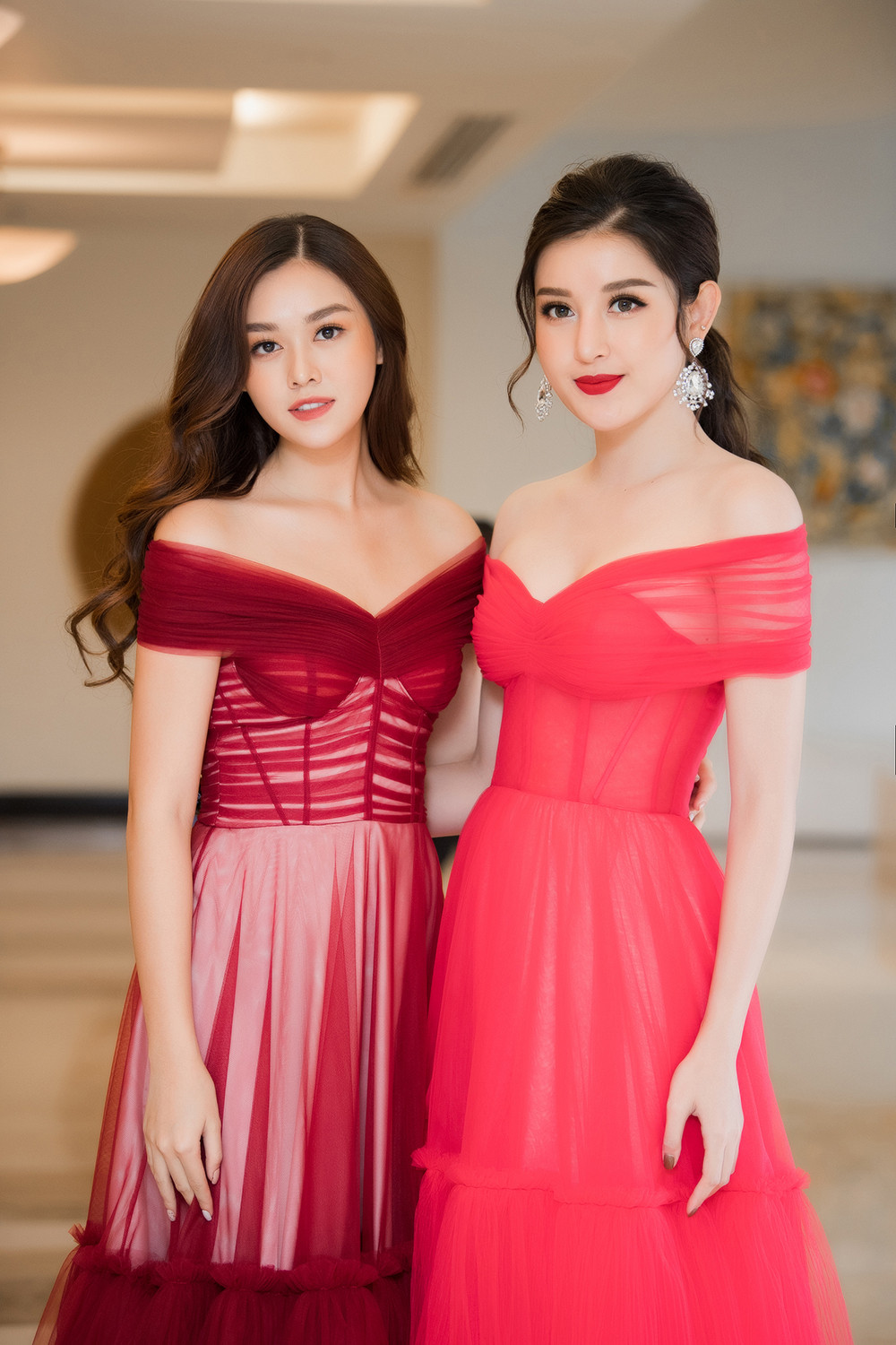 Không hẹn mà gặp, Á hậu Tường San và Á hậu Huyền My cùng chọn váy của NTK Lê Ngọc Lâm với tông màu đỏ và kiểu trễ vai khoe vòng một gợi cảm. Tuy nhiên, hai nàng Á hậu xinh đẹp vẫn mang tới những cảm nhận khác nhau nhờ phong cách trang điểm và làm tóc tinh tế của mình.