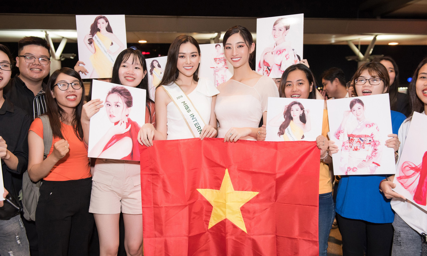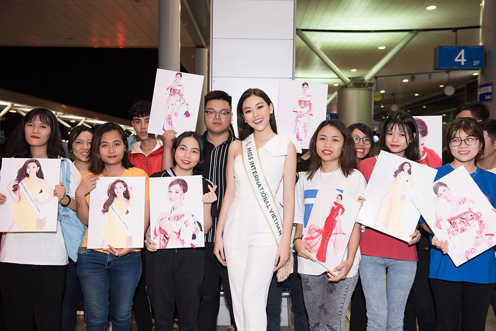 Nàng á hậu đeo sash Miss International Việt Nam, trên tay cầm lá cờ tổ quốc cùng sự ủng hộ, reo vang tên của rất đông người hâm mộ có mặt để tiễn cô lên đường.