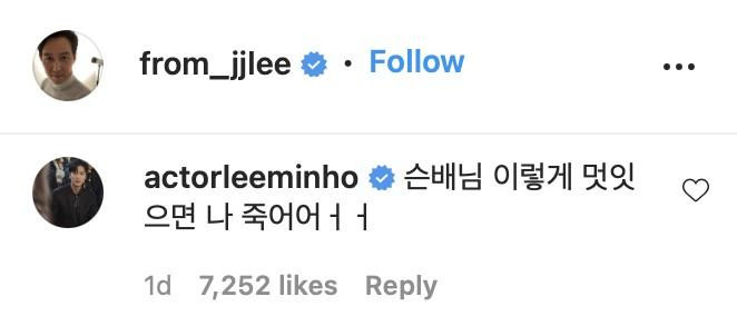 Lee Min Ho đã bình luận dưới bức ảnh của Lee Jung Jae: “Tiền bối à, nếu anh cứ tiếp tục đẹp trai như vậy thì em sẽ ngất xỉu mất!”. Nội dung bình luận này đã khiến cư dân mạng vô cùng ngạc nhiên. Từ trước đến nay, Lee Min Ho luôn được biết đến với hình tượng lạnh lùng, nam diễn viên vô cùng hiếm khi tương tác với những nghệ sĩ khác trên mạng xã hội.