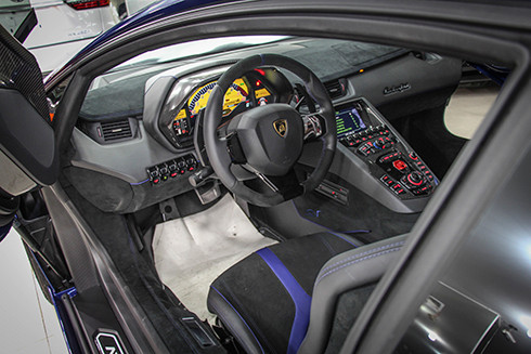 Chất liệu da cao cấp với hai bên hông cửa ốp carbon và một số chi tiết bên trong xe cũng làm bằng carbon. Nội thất mang tông màu đen với đường chỉ tay màu xanh dương tương phản. Logo “siêu bò” thêu chỉ xanh ngay trên tựa đầu. Điểm đặc biệt tại ghế ngồi chính là đường chỉ khâu và da màu xanh có kích thước lớn cùng logo SV, nổi bật phong cách thể thao cho chiếc siêu xe.  Màn hình hiển thị kiểu mới dễ quan sát được Lamborghini trang bị cho LP 750-4 SV.