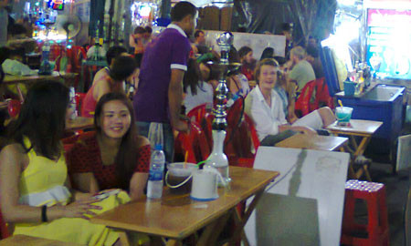 Có những bàn đèn ngồn ngộn đủ loại bình shisha được trang trí theo phong cách Thái chờ khách vào nuốt khói và có những bàn, khách phương Tây đa phần là giới trẻ đang chụm đầu vào nhau vít cần, nhả khói.