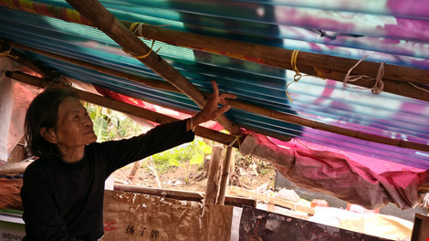 Mời khách vào "tham quan" túp lều, bà cười rất tươi, bảo mới được các anh chị từ thiện tặng mấy tấm nhựa cứng để lợp lên nóc. Trước lợp bằng bạt, chỉ cần mấy bữa nắng mưa là thủng lỗ chỗ, mỗi lần mưa là dột như ngoài trời. Bây giờ có tấm nhựa, mưa to cũng không sợ bị dột.