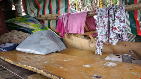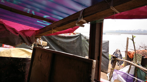 Tất cả dụng cụ, đồ đạc để dựng lều đều do một tay bà gom góp từng ngày. Xung quanh lều, bà chỉ dựng bằng các tấm ván, cao khoảng 30-40 cm, phần còn lại để trống. Bà bảo làm vậy thì gió sông mới vào được, mùa hè đỡ nóng. Đến mùa đông, bà buông tấm bạt trên nóc lều xuống, trùm kín nên sẽ ấm hơn.