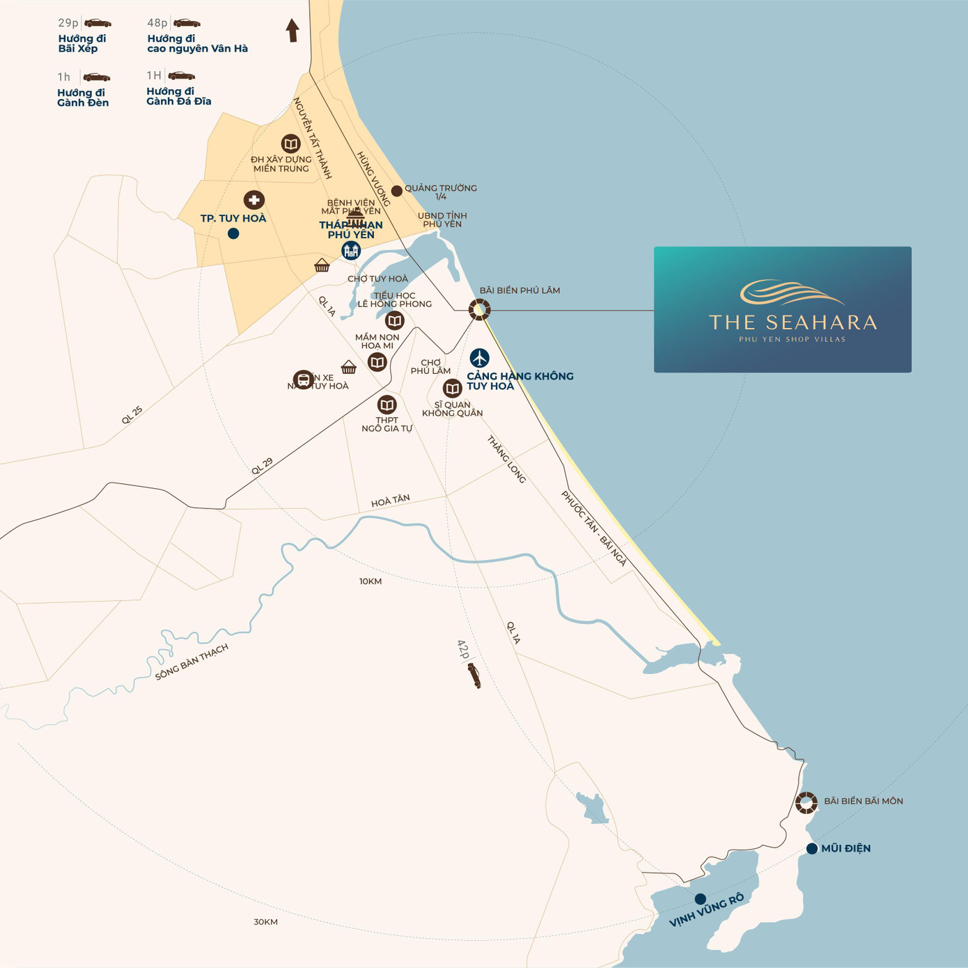 Dự án sở hữu vị trí đắt giá bậc nhất thành phố Tuy Hòa khi nằm trải dài bên bờ biển, một mặt giáp đường Trần Kiệt và một mặt giáp đường Hùng Vương, tạo nên vị thế “một mặt biển hai mặt phố” độc nhất tại Tuy Hòa. Hơn thế, The Seahara Phú Yên Shop Villas chỉ cách sân bay Tuy Hòa 3 phút di chuyển, giúp kết nối vô cùng thuận tiện với các địa phương khác trong cả nước cũng như quốc tế.