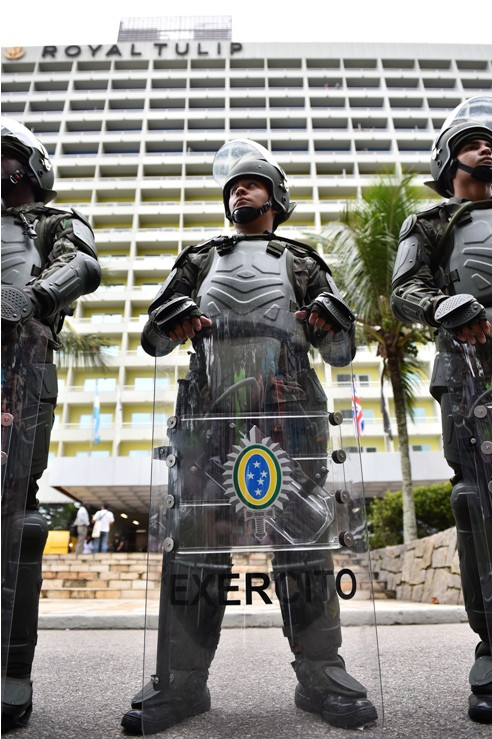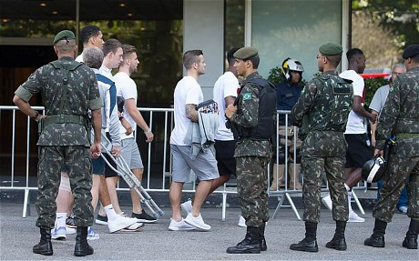 Khoảng 30 binh sĩ hộ tống, bảo vệ xe buýt chở tuyển Anh ngay khi đội đặt chân tới đất Brazil hôm 8/6