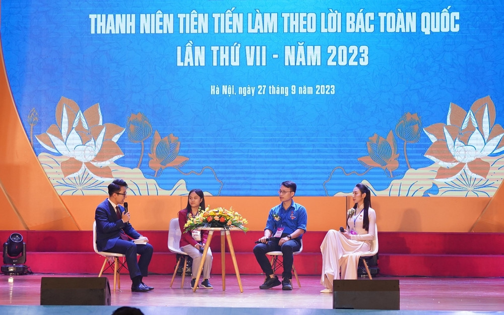 | Đồng chí Nguyễn Trọng Nghĩa, Bí thư Trung ương Đảng, Trưởng Ban Tuyên giáo Trung ương và đồng chí Bùi Quang Huy - Ủy viên dự khuyết T.Ư Đảng, Bí thư thứ nhất T.Ư Đoàn trao chứng nhận Thanh niên tiến tiến làm theo lời Bác toàn quốc lần thứ VII năm 2023 và tặng hoa chúc mừng các điển hình thanh niên tiên tiến tiêu biểu. |