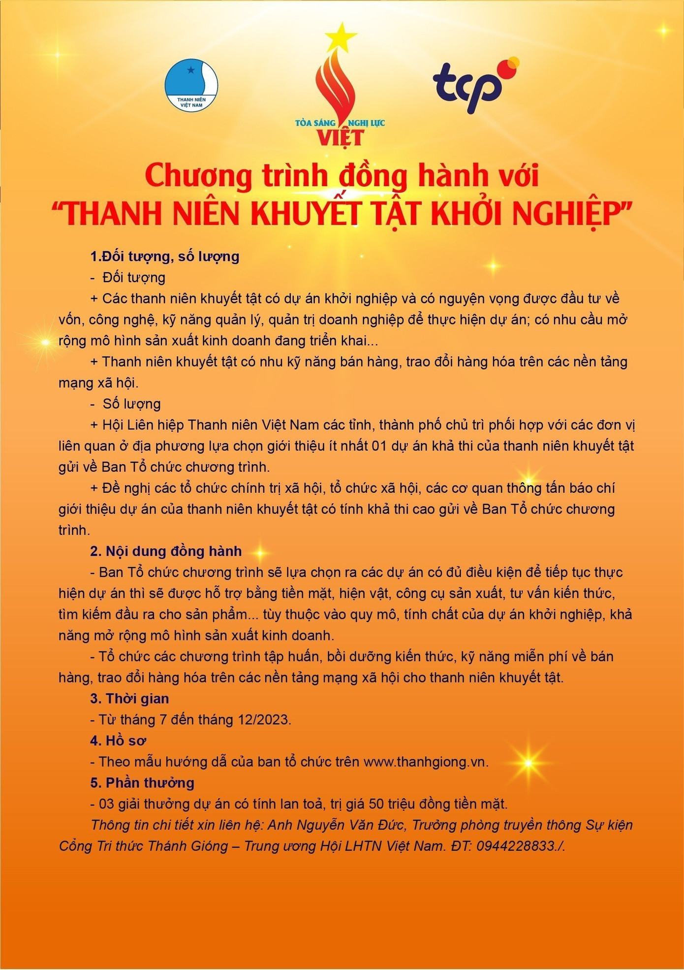 Theo kế hoạch, Chương trình Tỏa sáng Nghị lực Việt năm 2023 do T.Ư Hội LHTN Việt Nam phối hợp với Công ty TNHH TCP Việt Nam triển khai từ tháng 7 đến tháng 12/2023.