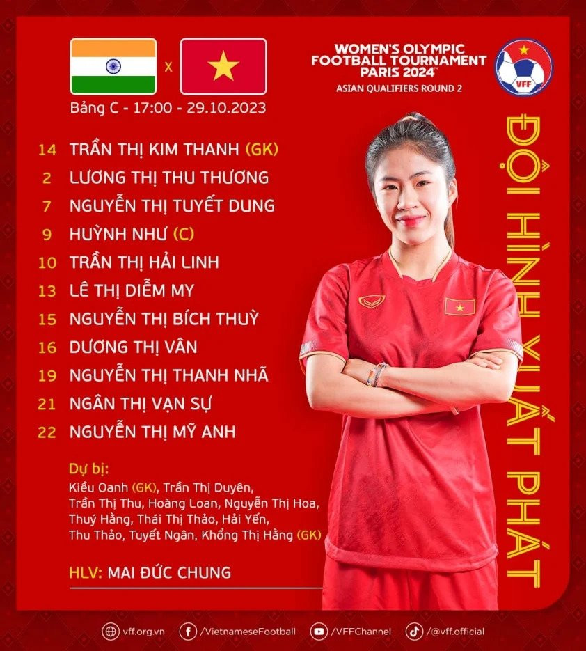 33': Từ thủ môn Kim Thanh, bóng được triển khai đến vị trí của Huỳnh Như và Thanh Nhã có bóng. Cô đi bóng dũng mãnh và sửa lòng chuẩn xác. Nhưng thủ môn Ấn Độ đã xuất sắc.