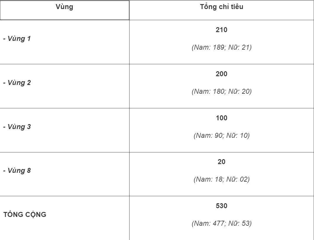 Tổng chỉ tiêu tuyển sinh là 530 chỉ tiêu đào tạo nhóm ngành Nghiệp vụ Cảnh sát (Nam: 477; Nữ: 53) theo từng phương thức tuyển sinh, địa bàn và giới tính, cụ thể như sau: