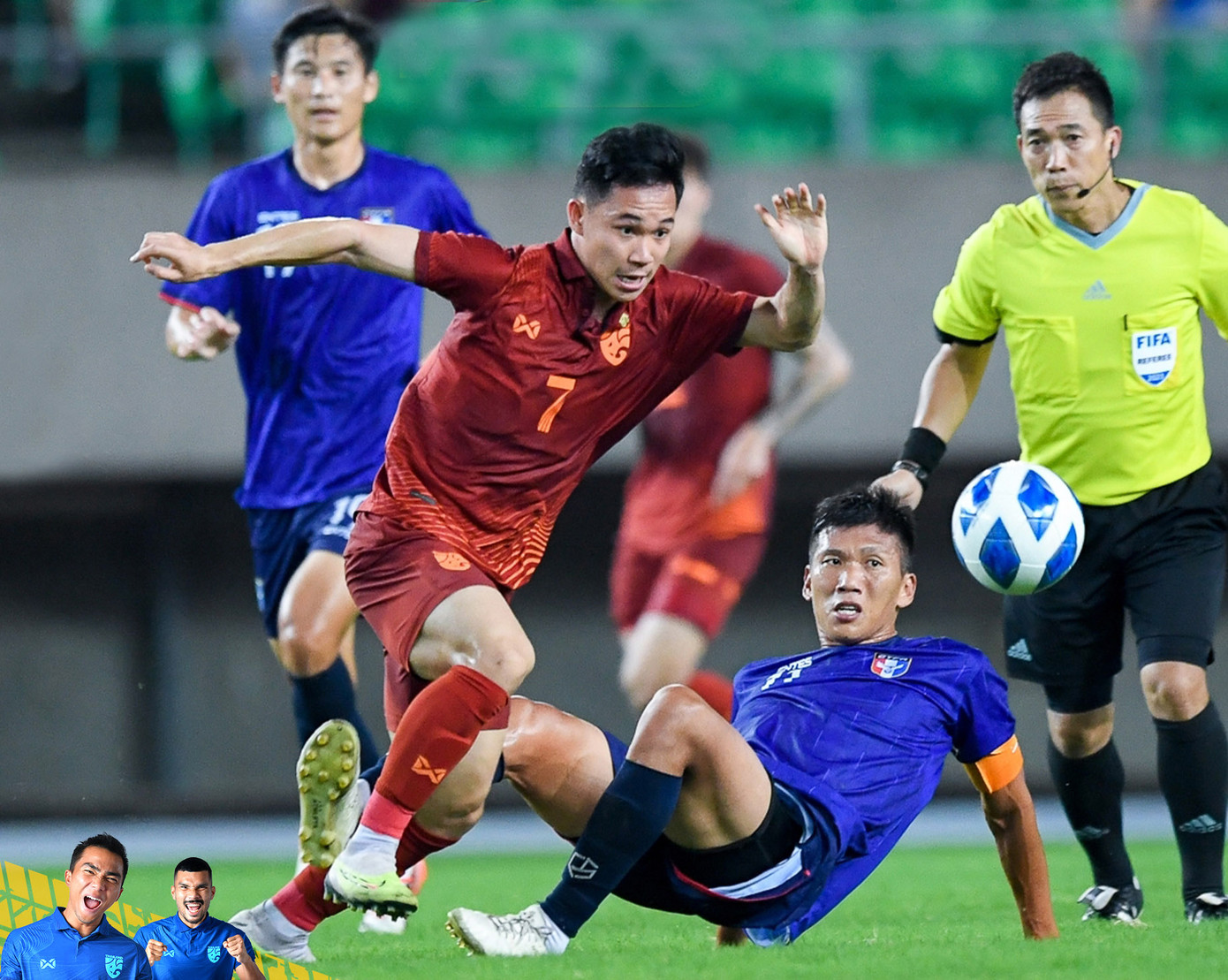 Cơ hội ra về với chiến thắng của Thái Lan đến ở phút bù giờ thứ 3, khi Chanathip mở bóng rất thoáng cho Sarach Yooyen. Sau đó tiền vệ này đệm vào để Pomphan băng lên dứt điểm cận thành. Nhưng từ cự ly chỉ 7m, Pomphan lại đưa bóng đi chệch cột dọc đáng tiếc. Tình huống này khép lại trận đấu. Thái Lan trải qua trận thứ ba không thắng liên tiếp.