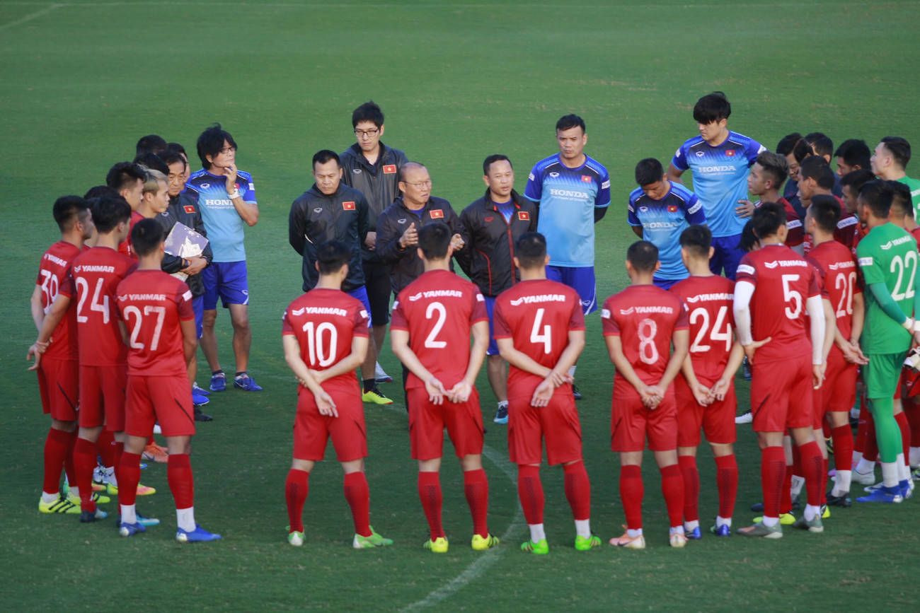 Như thường lệ, trước mỗi buổi, "thầy Park" luôn gọi các học trò tập trung để truyền đạt về các bài tập trong ngày. Hôm nay (16/11), các tuyển thủ đều nghiêm túc lắng nghe để chuẩn bị cho trận đấu sắp tới với đội tuyển Thái Lan.
