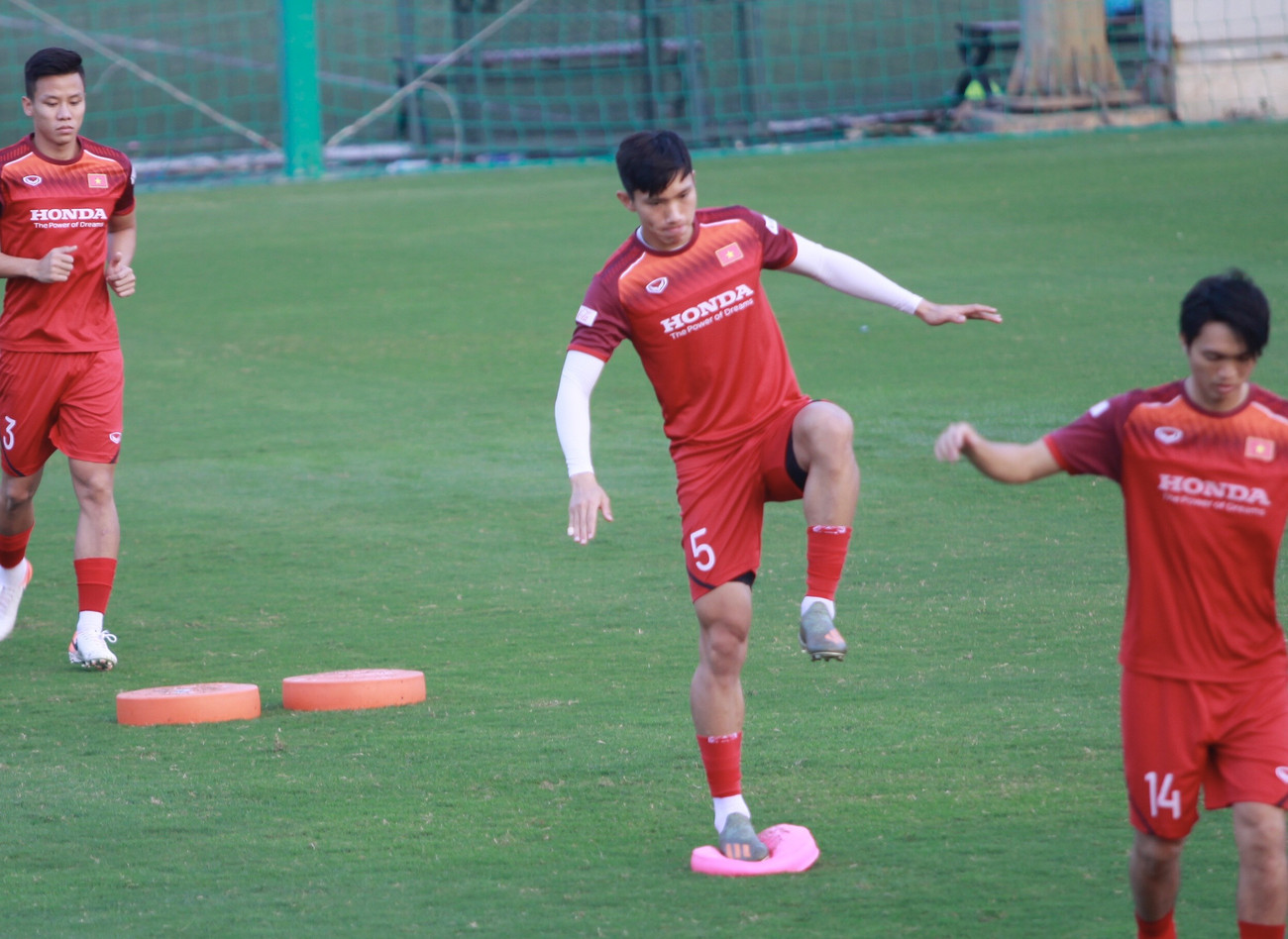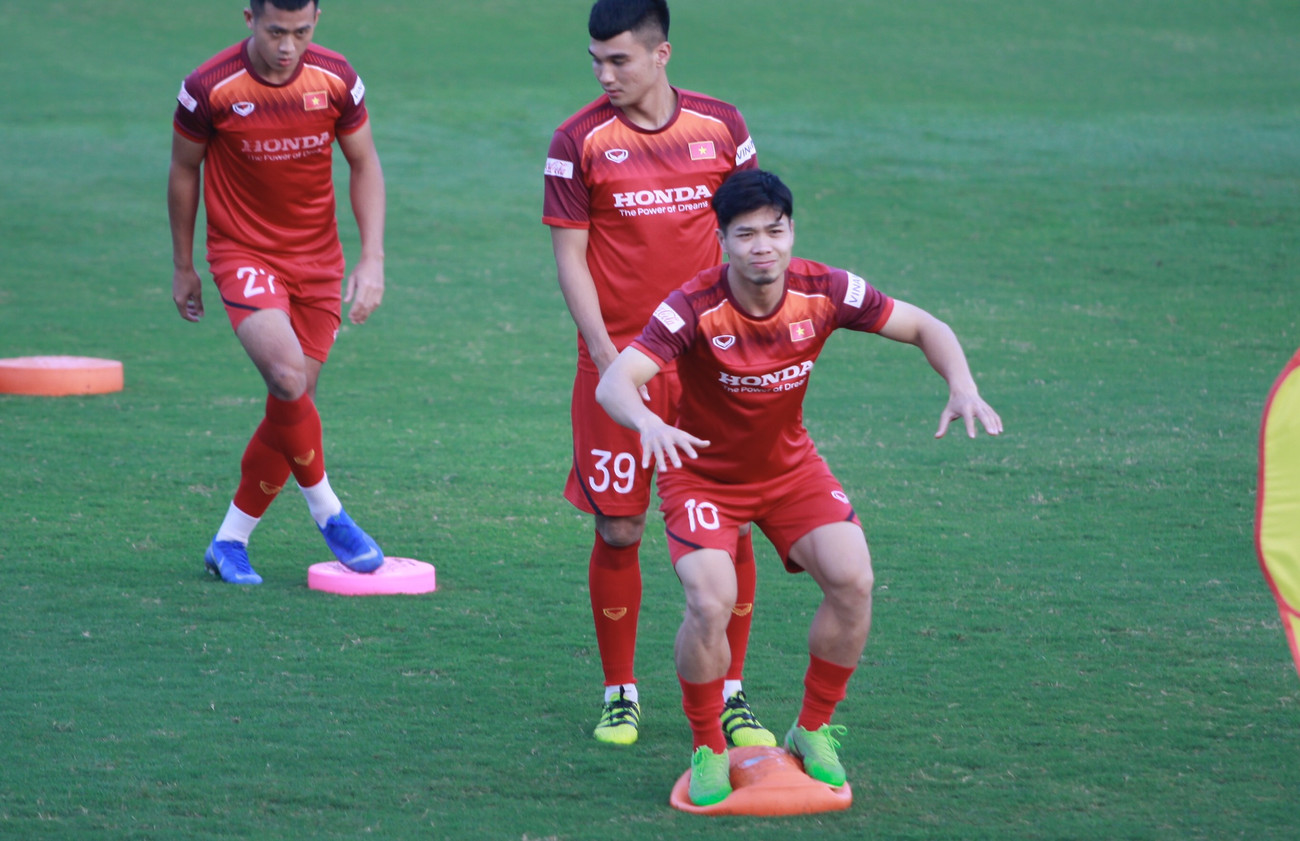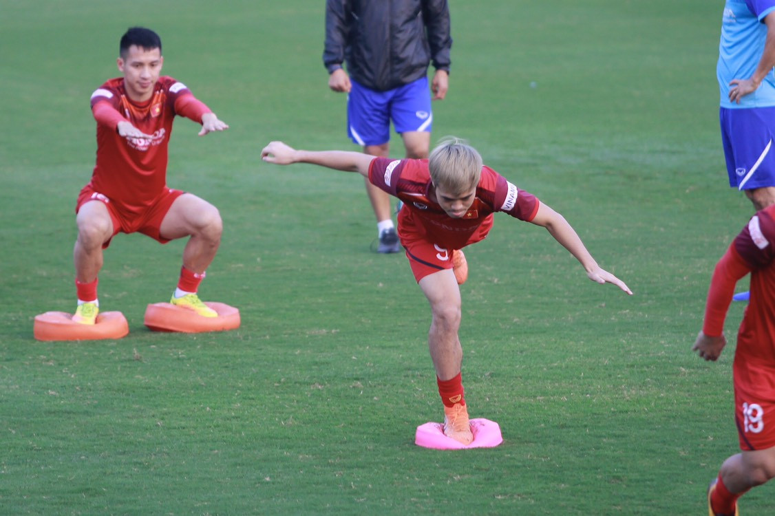 Trong 25 phút đầu tiên, tuyển Việt Nam chủ yếu tập khởi động, các bài tập giúp cầu thủ giữ thăng bằng. Công Phượng thể hiện bộ mặt khá tươi tỉnh.
