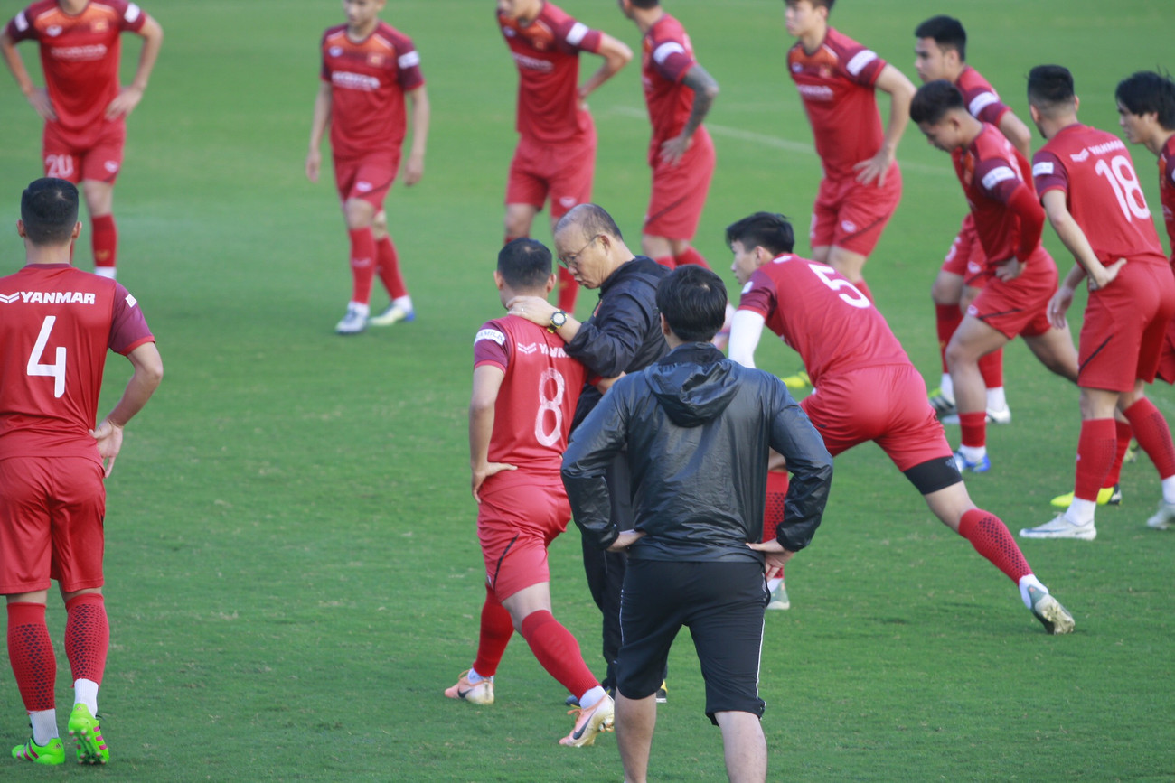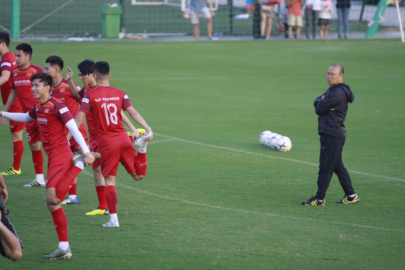 Quan sát toàn bộ các cầu thủ từ xa và uốn nắn riêng cho những người chưa thực hiện đúng là thói quen của HLV Park Hang-seo.