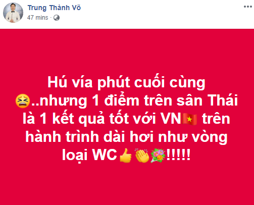 Trong khi đó, MC Thành Trung bày tỏ: "Hú vía phút cuối cùng.. nhưng 1 điểm trên sân Thái là 1 kết quả tốt với Việt Nam trên hành trình dài hơi như vòng loại World Cup".