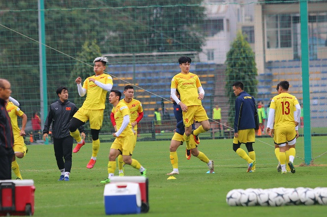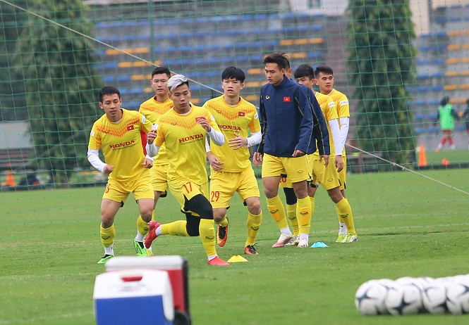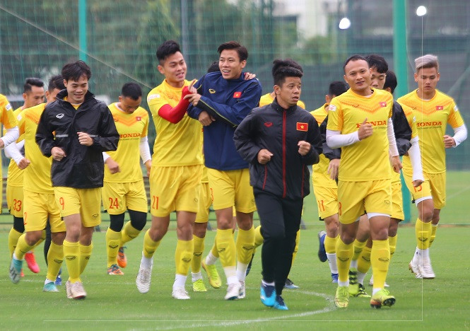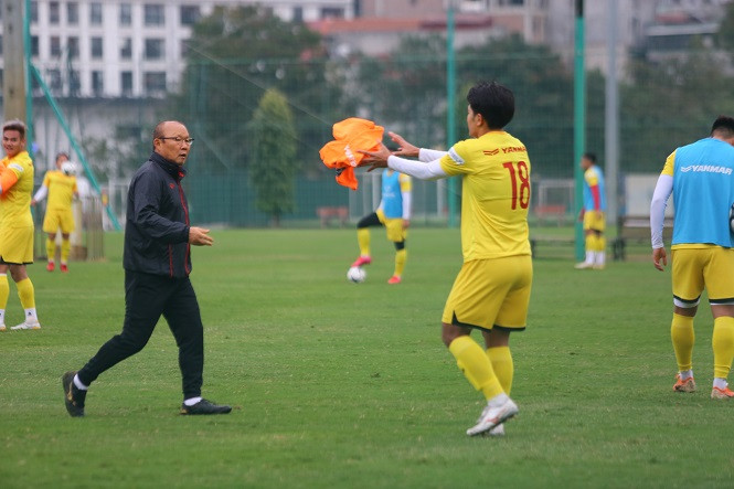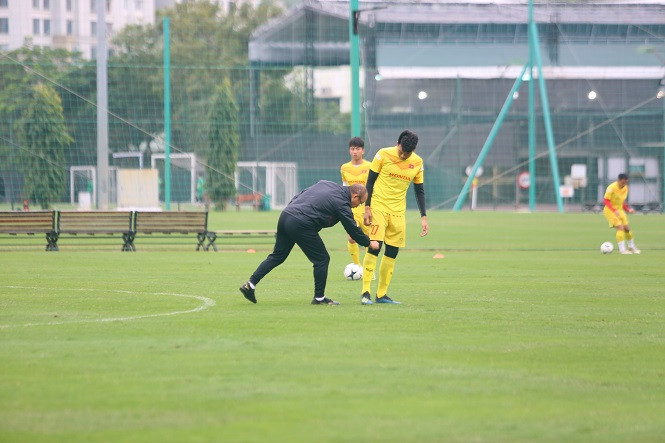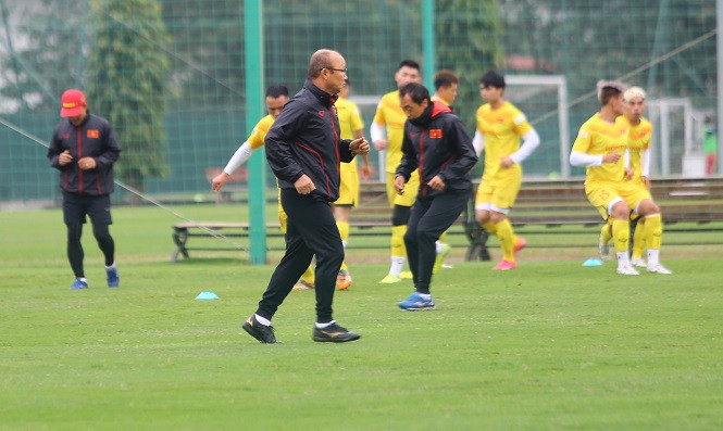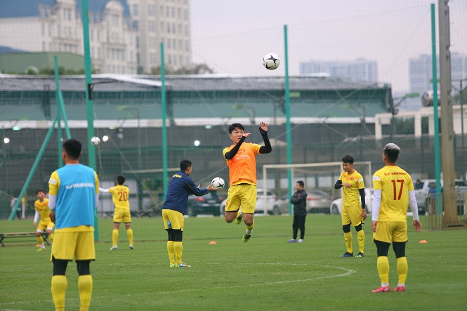 Đầu buổi tập chiều 15/12, HLV Park Hang Seo dành phần lớn thời gian để cho đội tuyển Việt Nam làm nóng cơ thể và rèn thể lực. Sau phần này, các cầu thủ mới bắt đầu rèn chiến thuật, vị trí di chuyển và bài tập luân chuyển bóng.